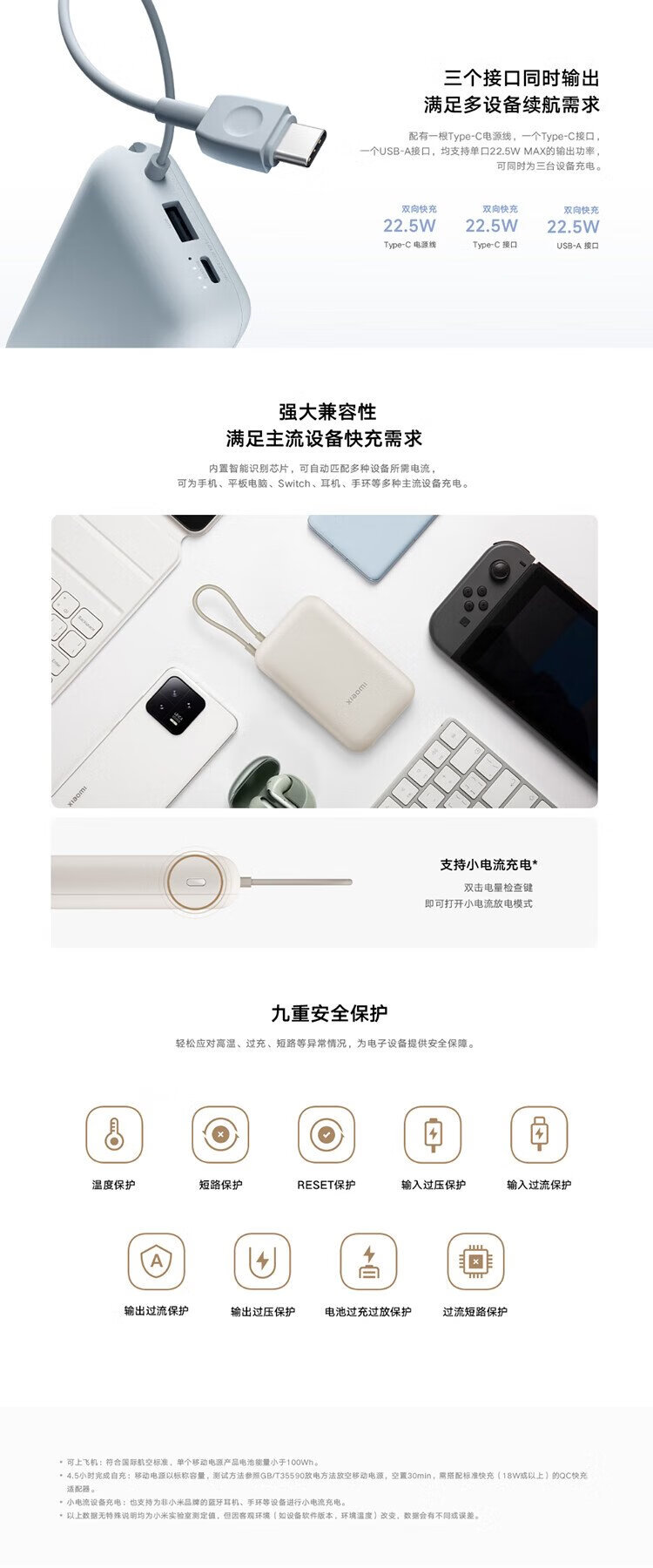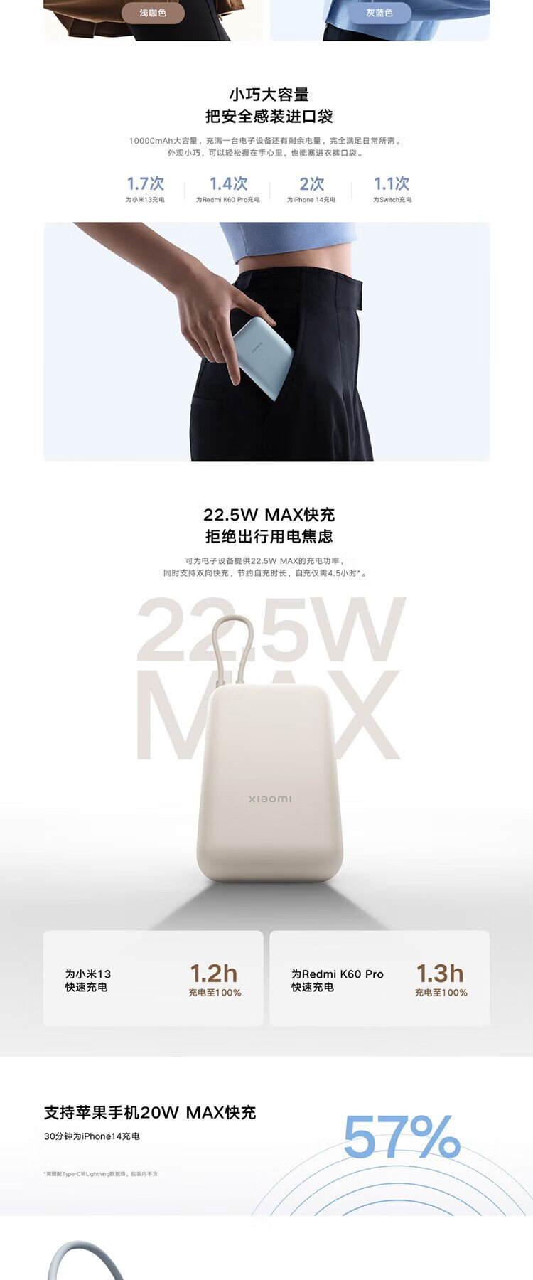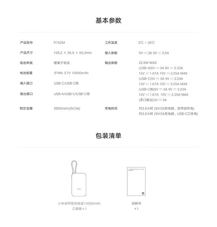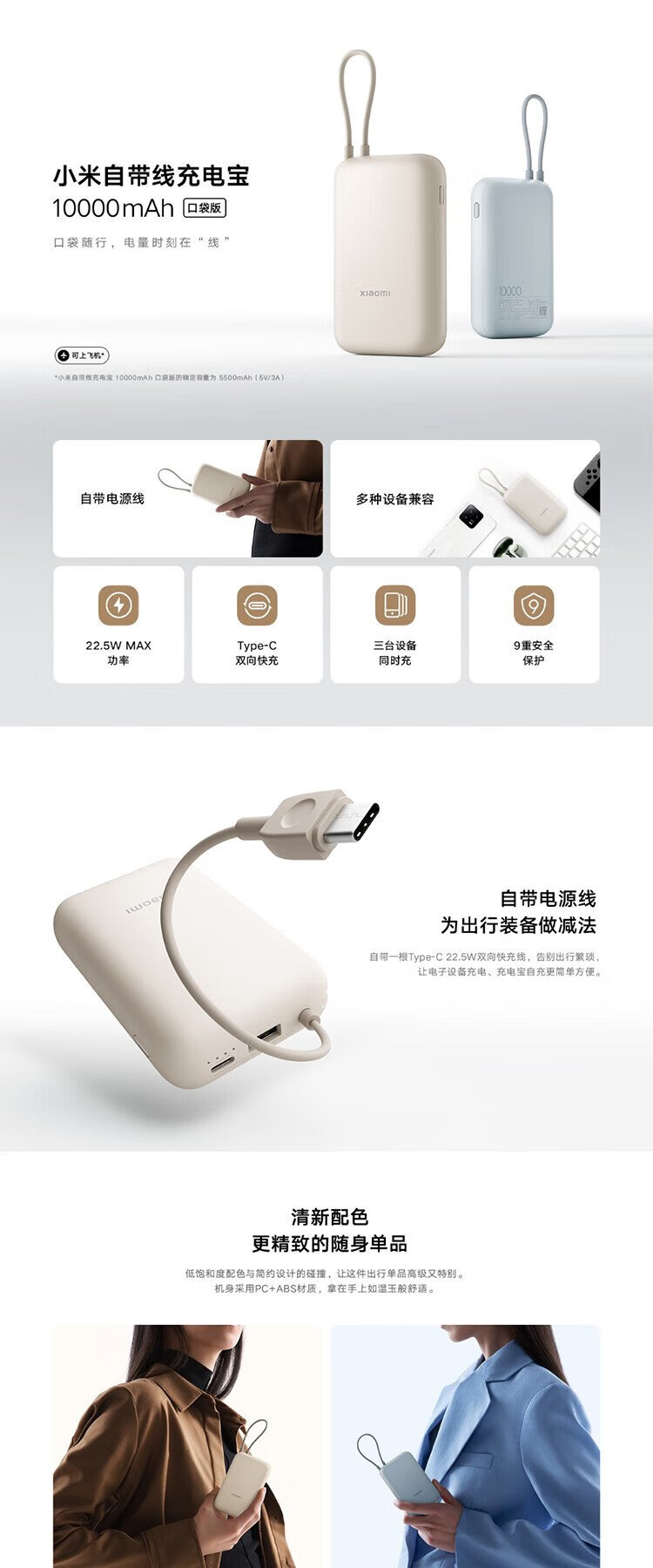 Xiaomi (MI) 3C certified, built-in wired power bank 10000mAh pocket version mobile power supply, can be used on aircraft Type-C two-way fast charging, 22.5W high power, suitable for Xiaomi and Apple, light coffee color
