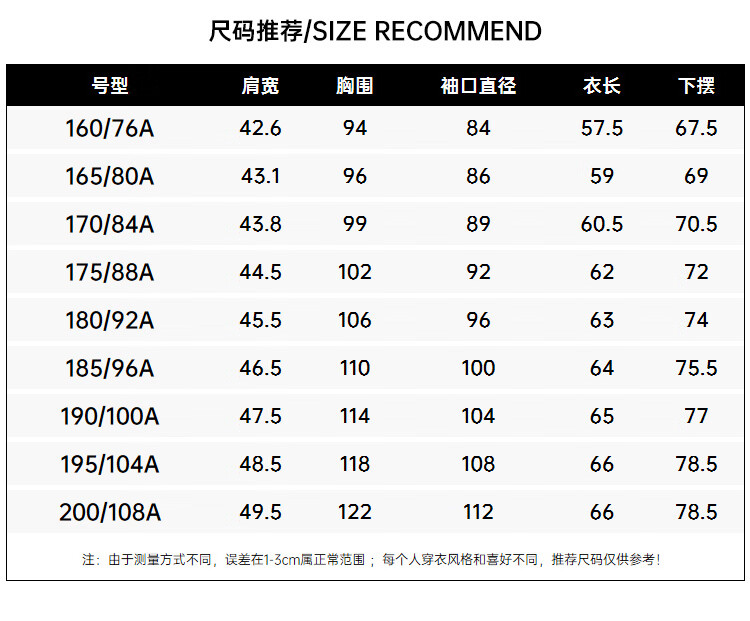 China (cm) 160-165/84-86 165-170 / 88-90 167-172 / 92-96 168-173 / 98-102 170-176 / 106-110
