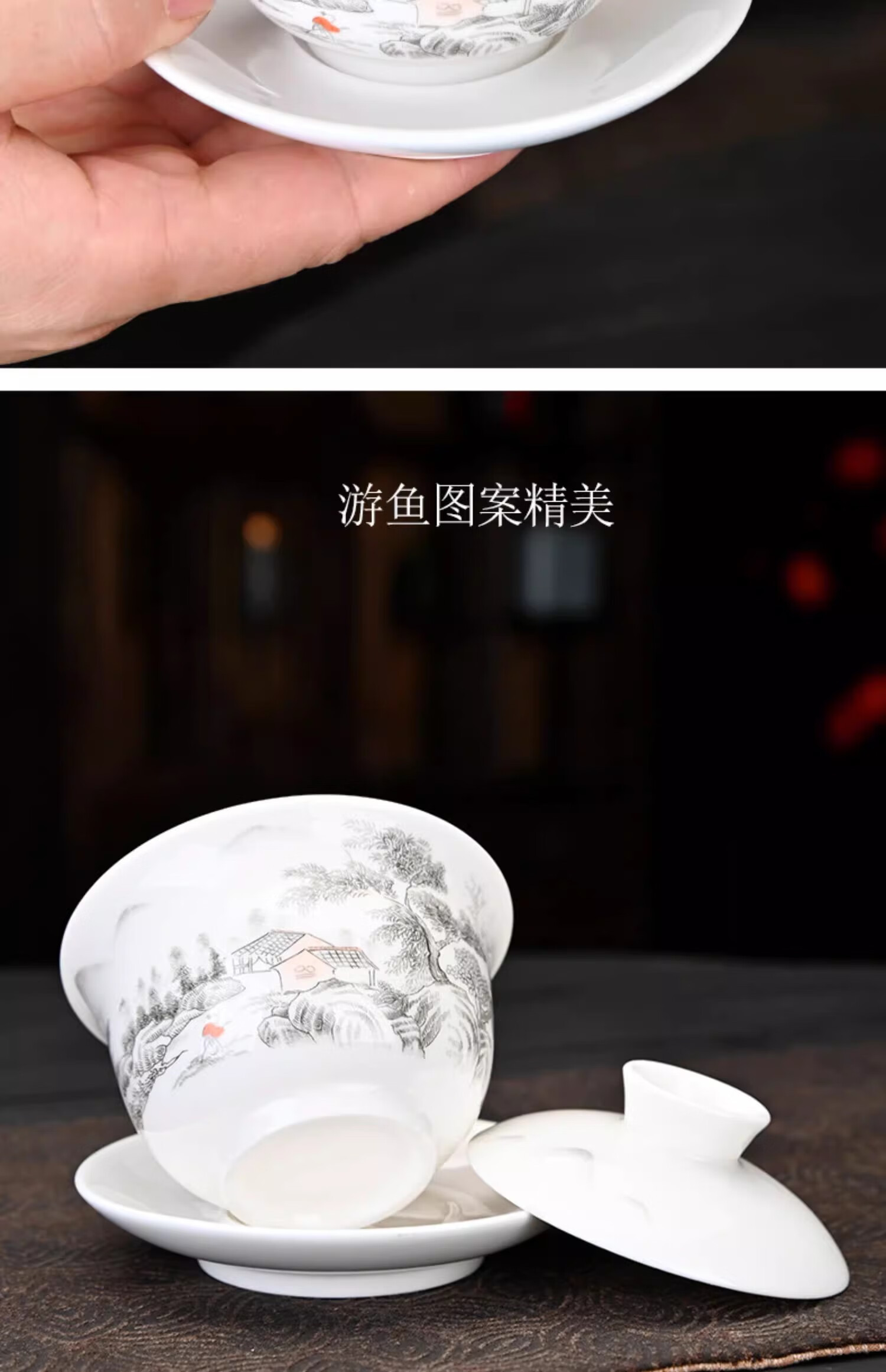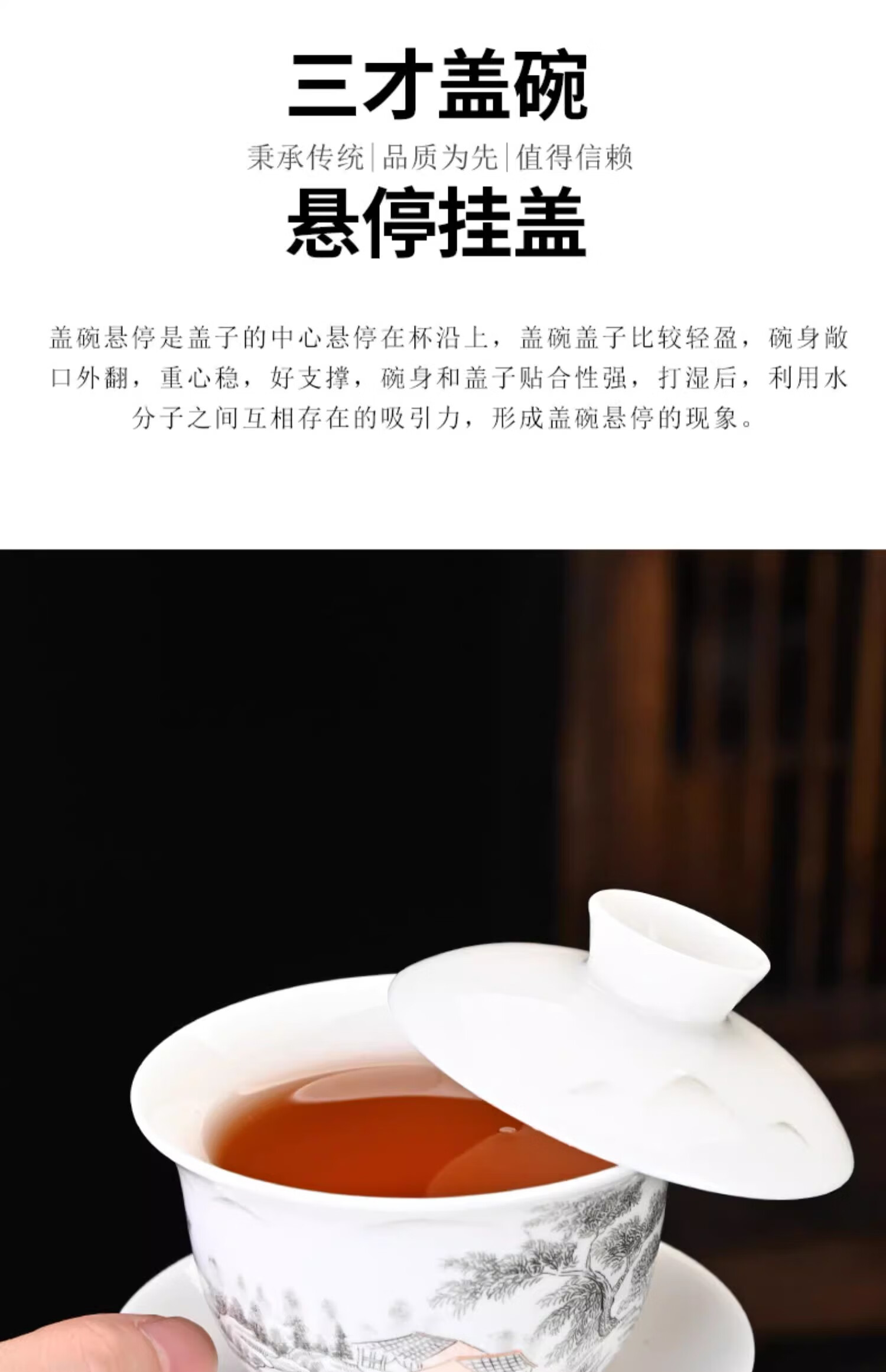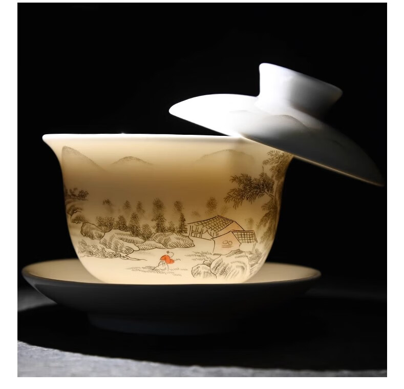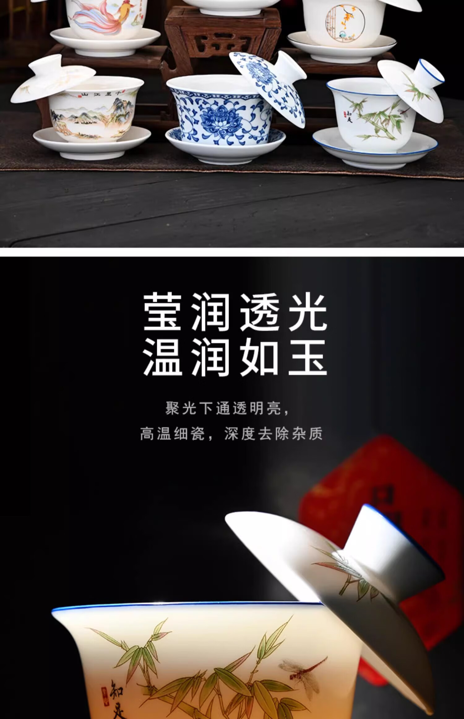 Baolin hovering rotating three-cai tureen tea cup single household Kung Fu tea set large non-hot high-end tea bowl 180ml hovering tureen-mutton fat jade-Mengli Water Village