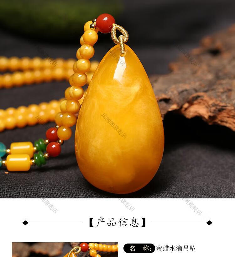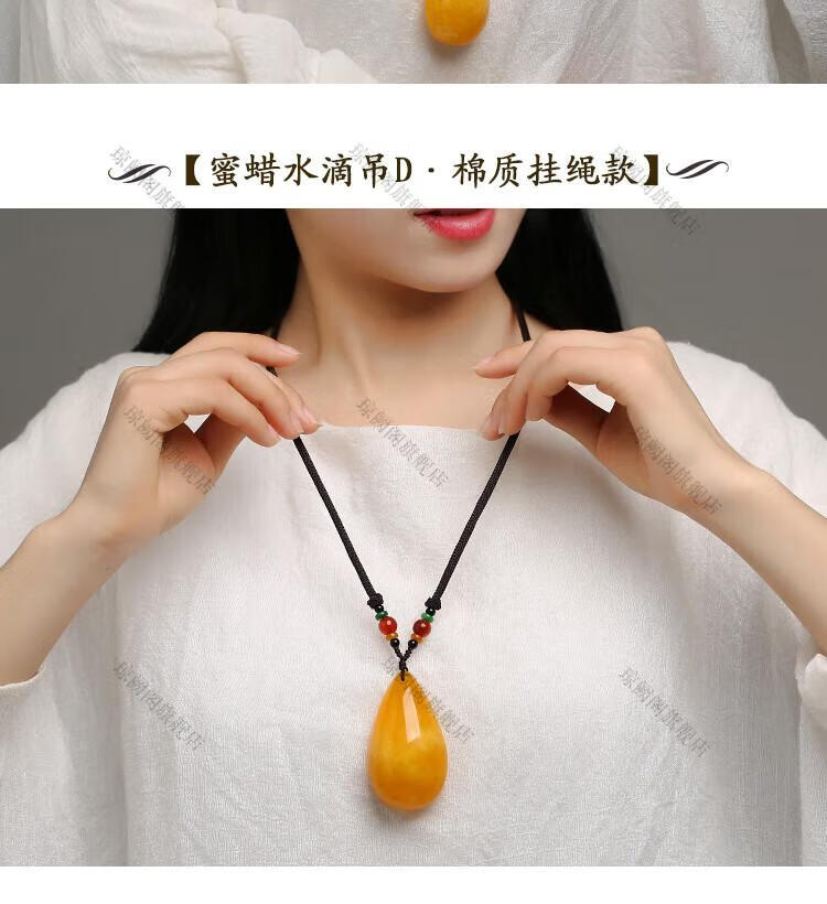 Qiongque Pavilion Beeswax Pendant Amber Raw Stone Chicken Fat Yellow Honey Water Drop Square Brand Blood Amber Sweater Necklace for Men and Women Beeswax Water Drop C Bead Chain Style