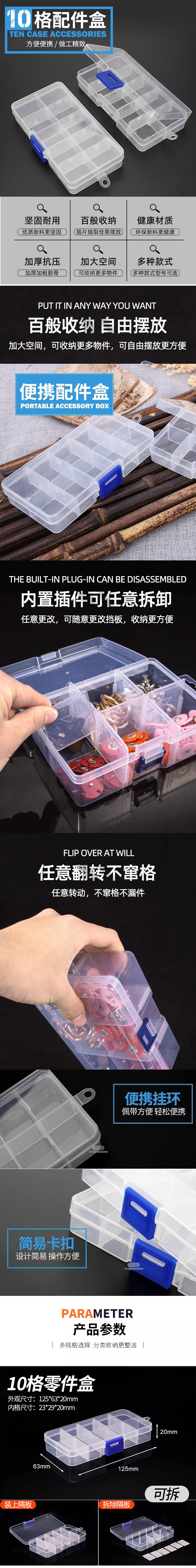 Plastic storage box, transparent multi-grid electronic component parts, screw sorting box, rectangular sample box, 10 grids, removable, 2 pieces