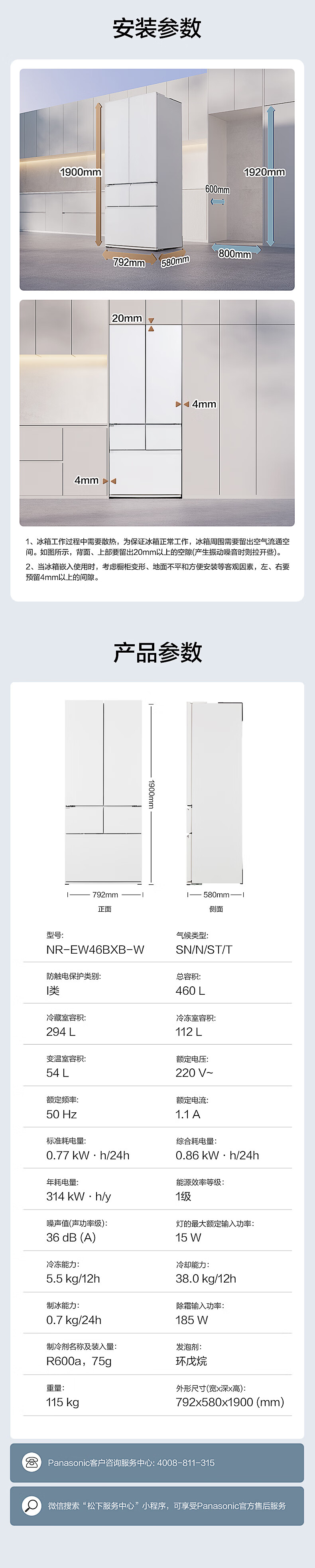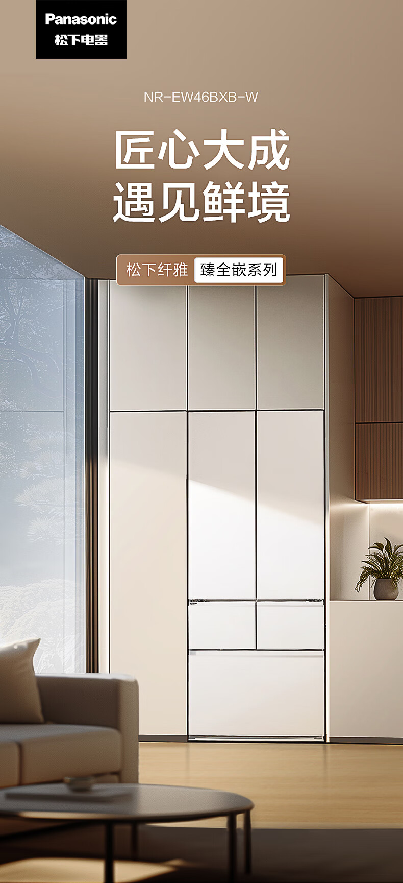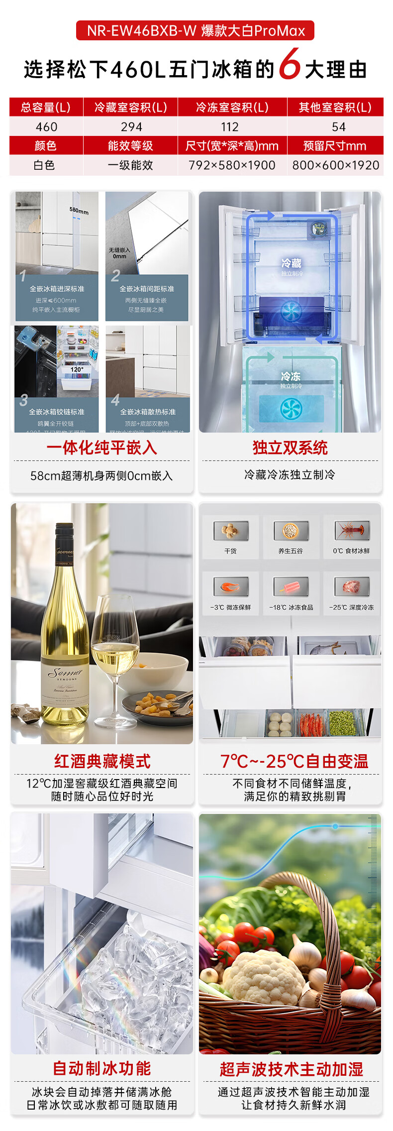 Panasonic 460-liter French-style multi-door five-door refrigerator 58CM deep ultra-thin zero-embedded first-level energy-efficiency dual-cycle dual-system automatic ice making home NR-EW46BXB-W popular Dabai ProMax