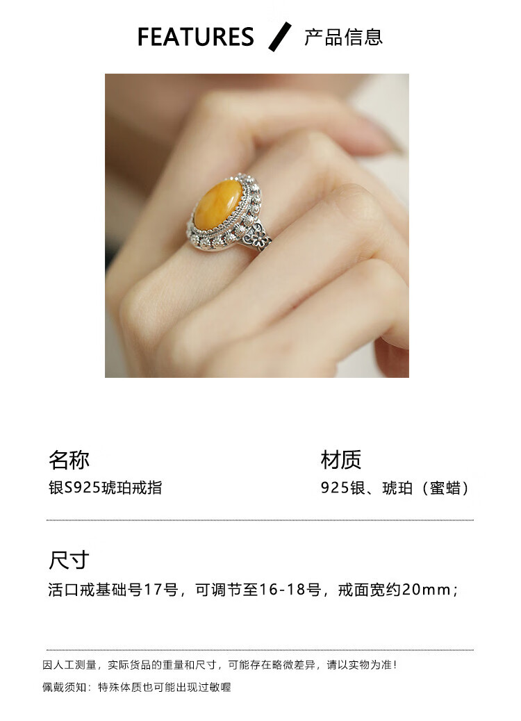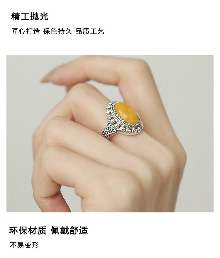 BOIGO925 silver amber beeswax ring women's retro luxury new Chinese style high-end open ring