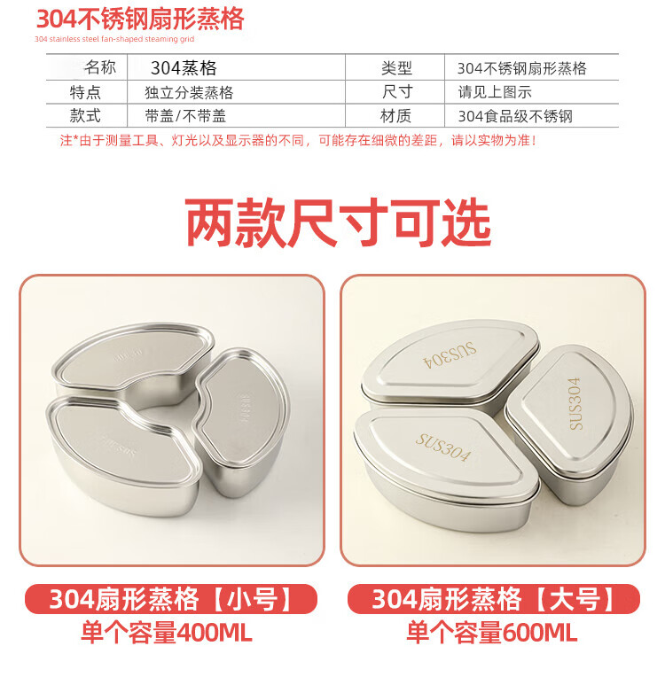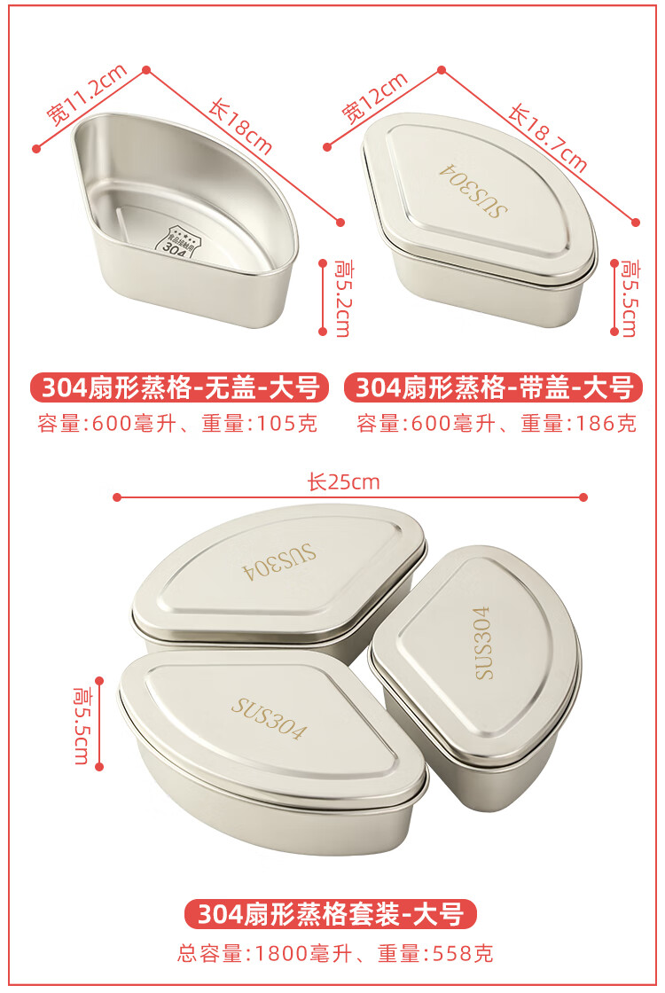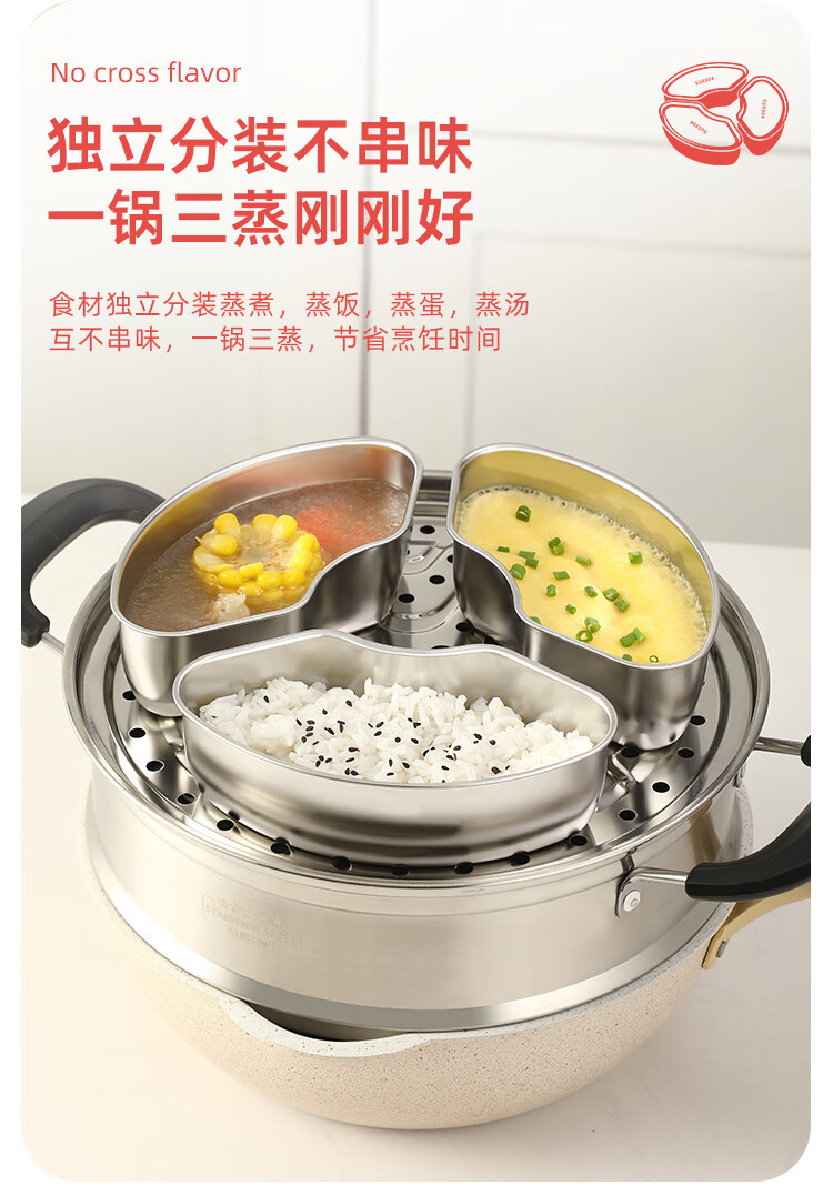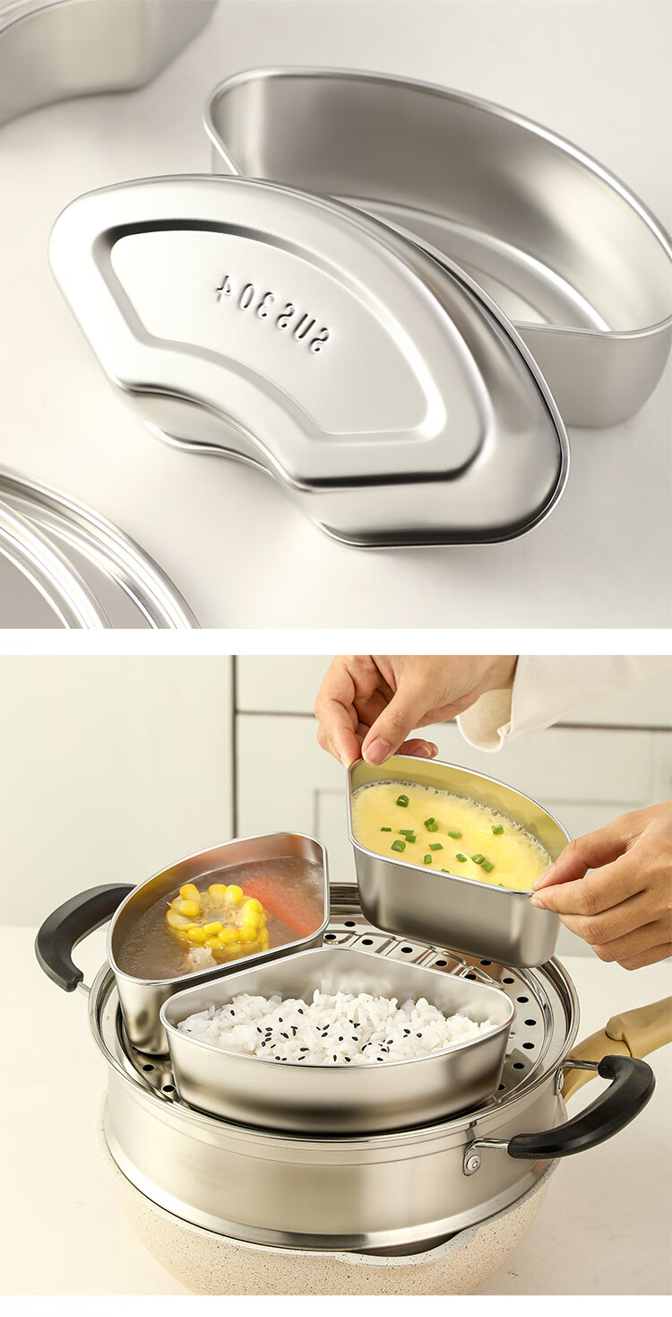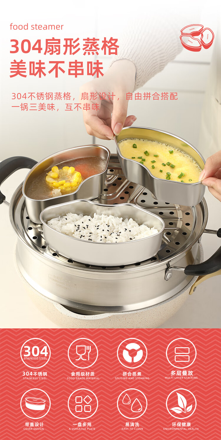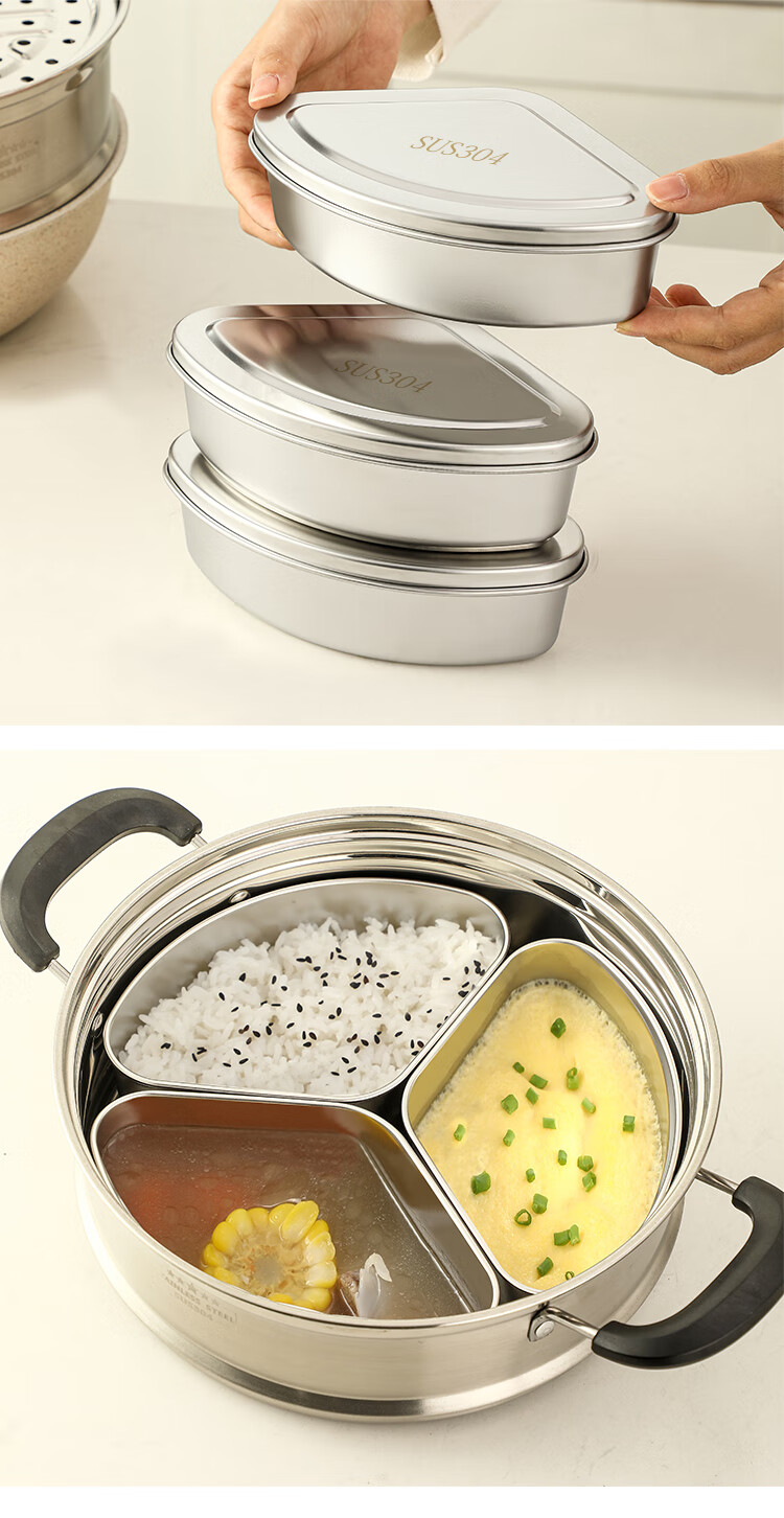 Leishton 304 stainless steel fan-shaped steaming box, rice cooker, steaming bowl, small cooking pot, divided steaming plate, household steamer drawer, steaming vegetable artifact sus304 3 pieces/large size with lid/come with anti-scalding clip