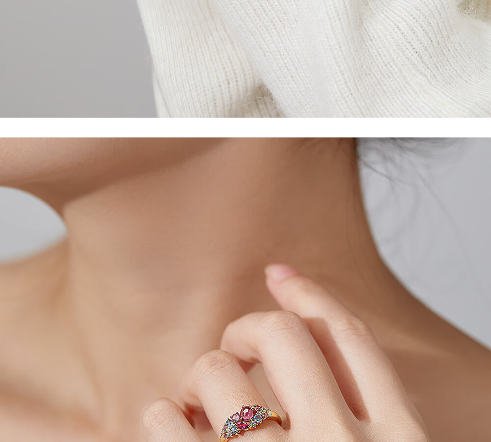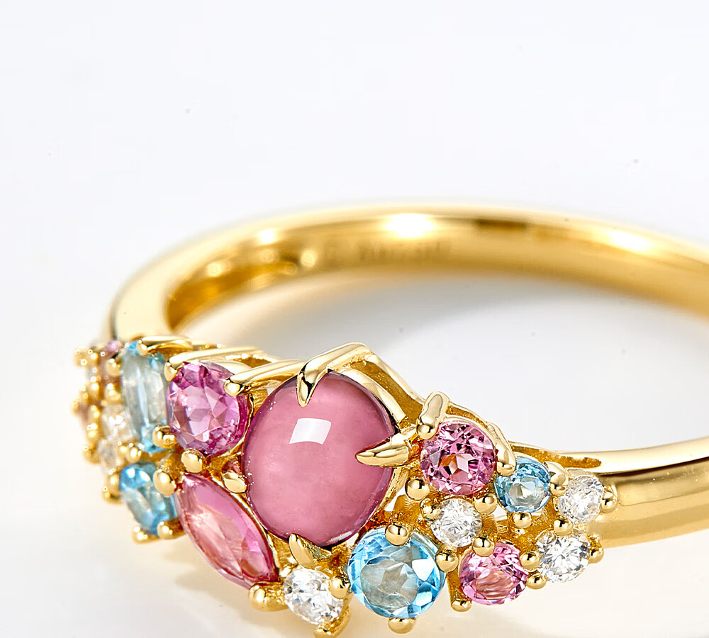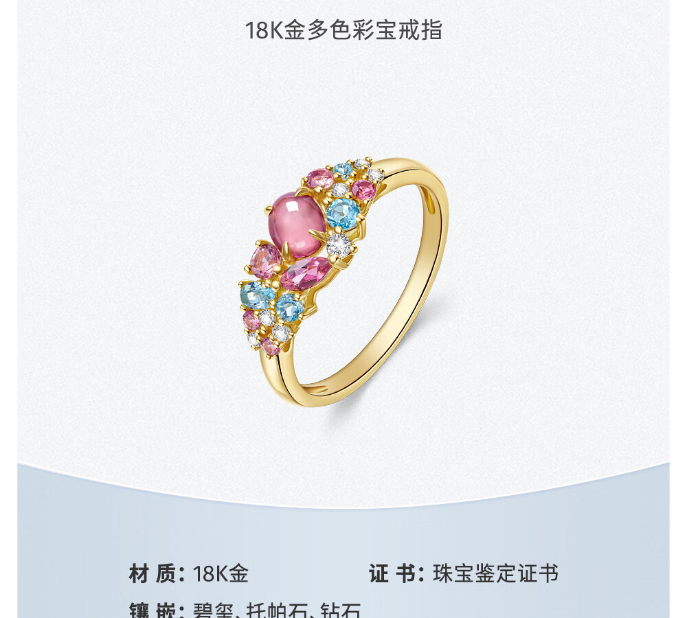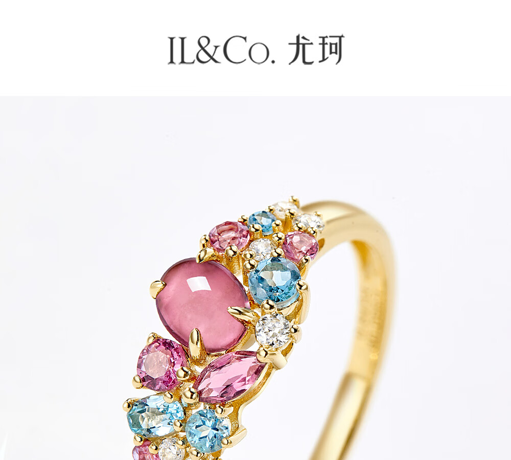 IL&CO Youke Hecaihuaxin 18K gold natural pink tourmaline ring multi-color gemstone birthday and Valentine's Day gift for women, tourmaline + topaz + diamond, total about 0.8 carats, size 13