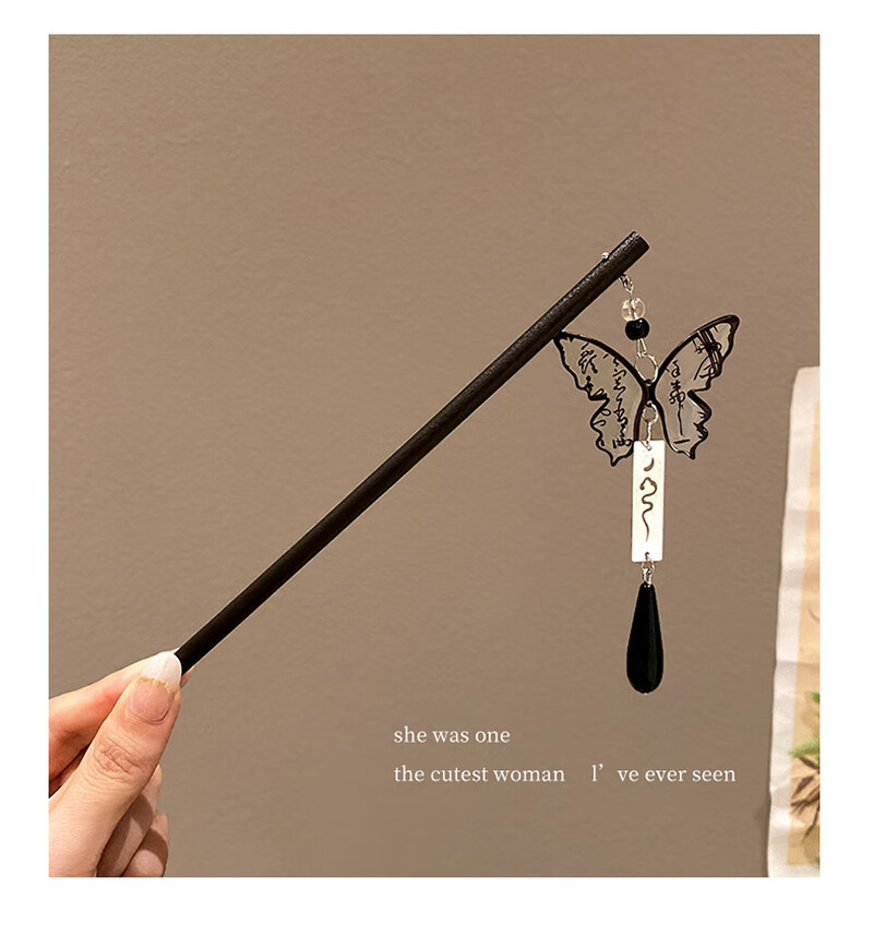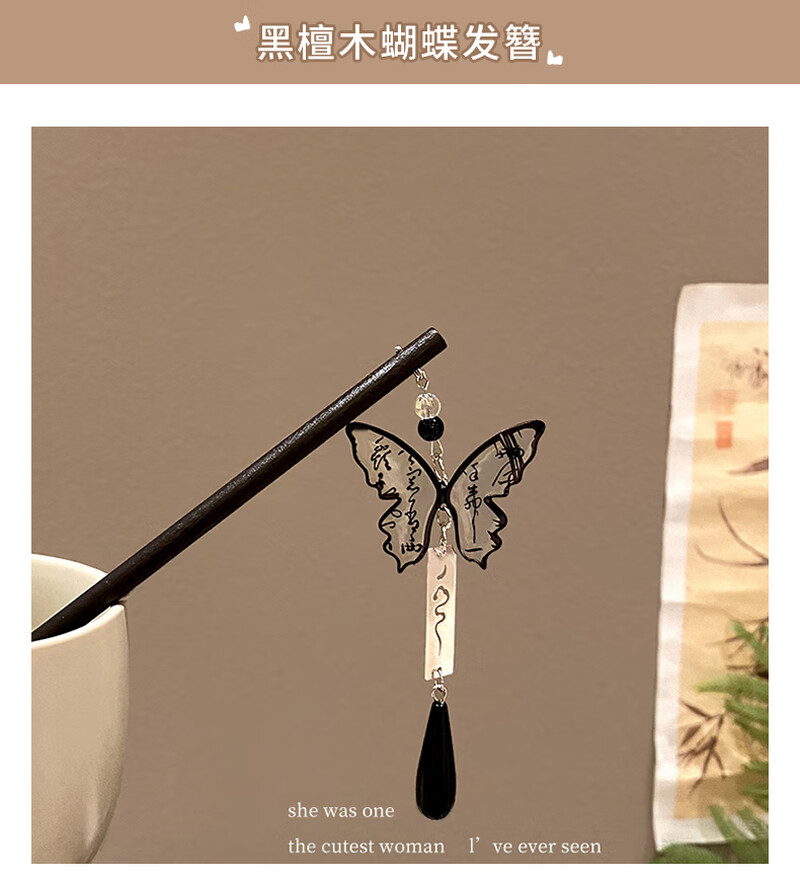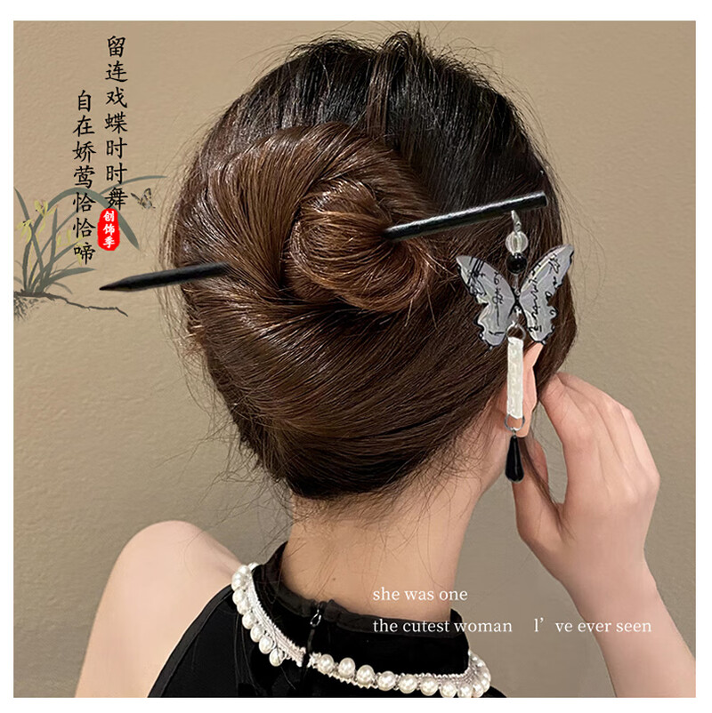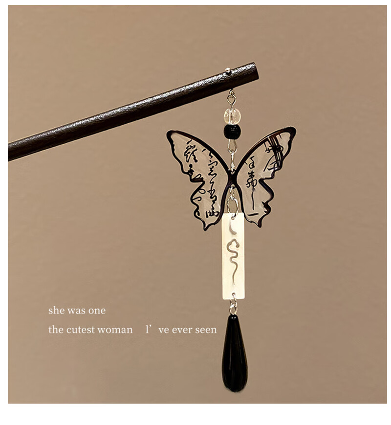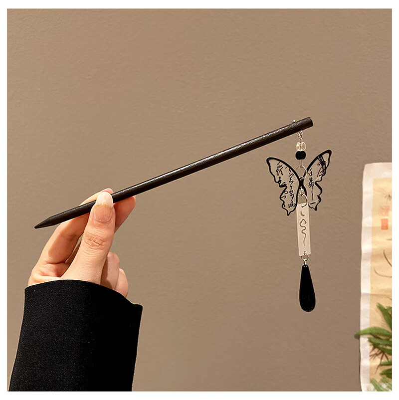 Shantou Lincun New Chinese Calligraphy Butterfly Hairpin Women's Tassel Black Muzan Ancient Style Elegant Double Hairpin Hanfu Cheongsam Hairpin Headdress Ink Butterfly Double Hairpin