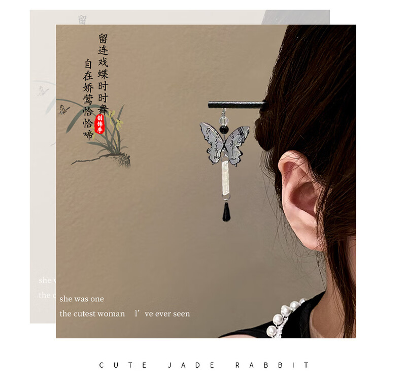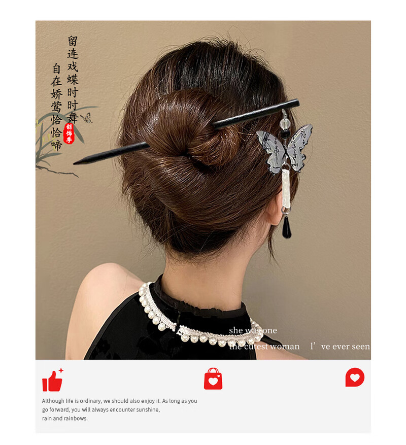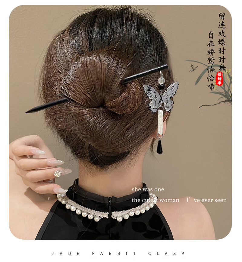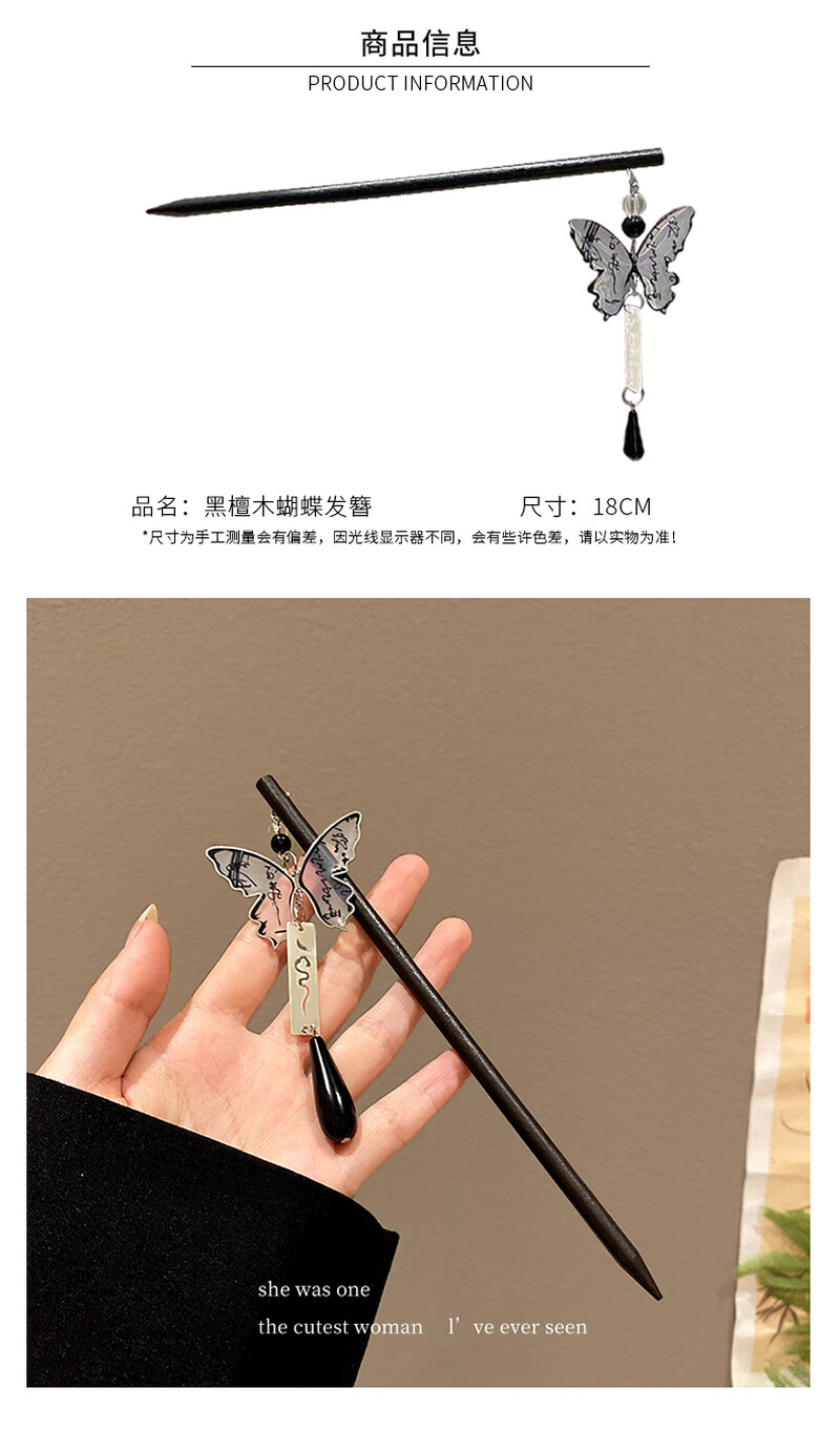 Shantou Lincun New Chinese Calligraphy Butterfly Hairpin Women's Tassel Black Muzan Ancient Style Elegant Double Hairpin Hanfu Cheongsam Hairpin Headdress Ink Butterfly Double Hairpin