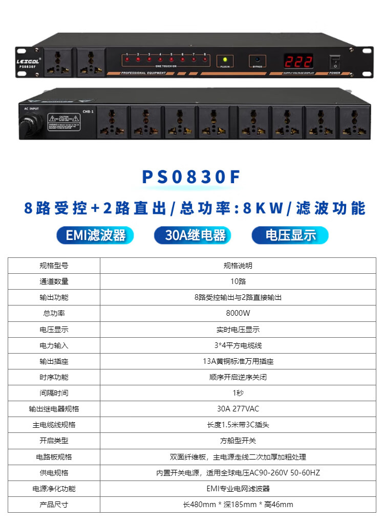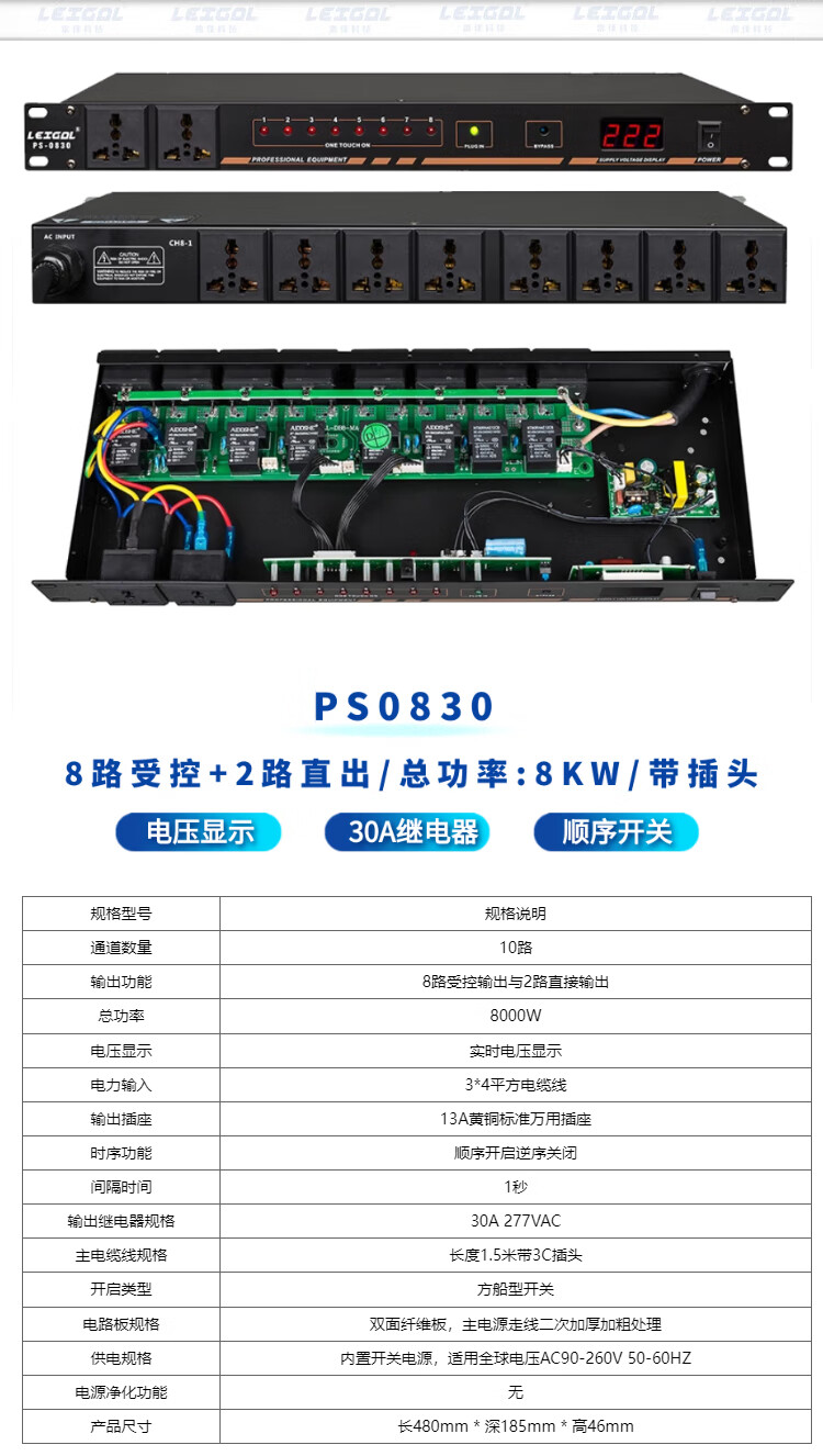 Leijia power sequencer filter sequence power manager central control RS232 serial port sequence power controller power sequencer PS0830 voltage display + 5-year warranty