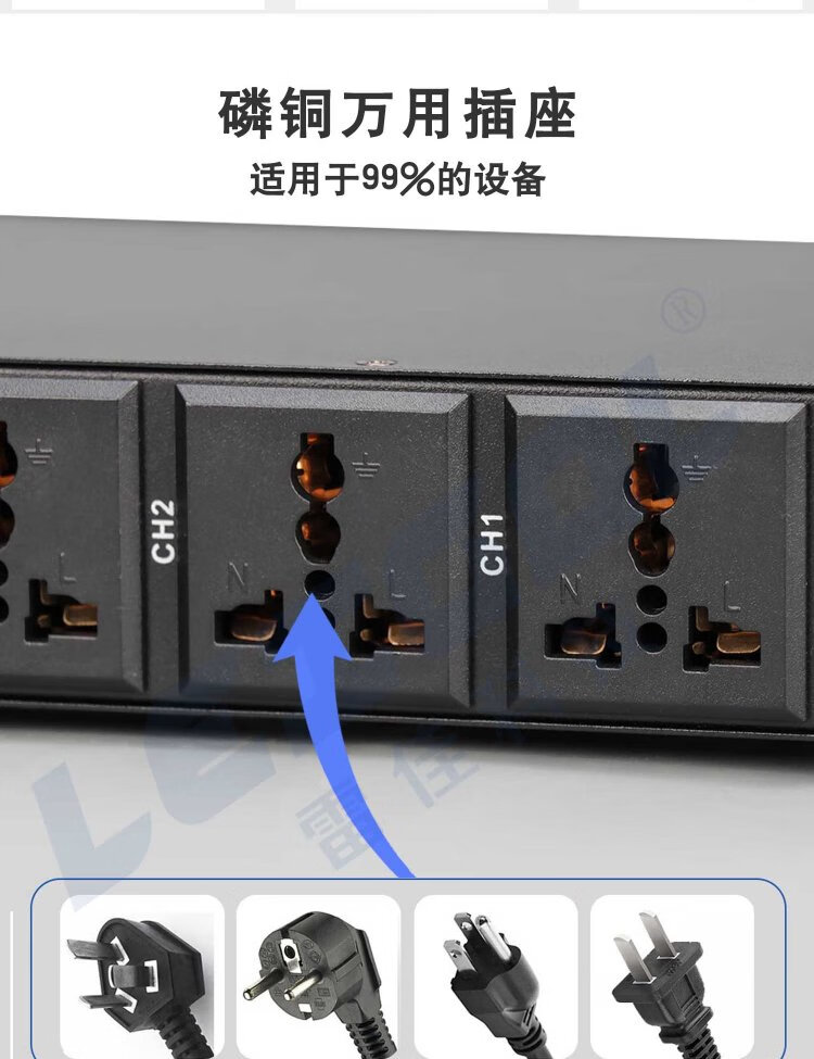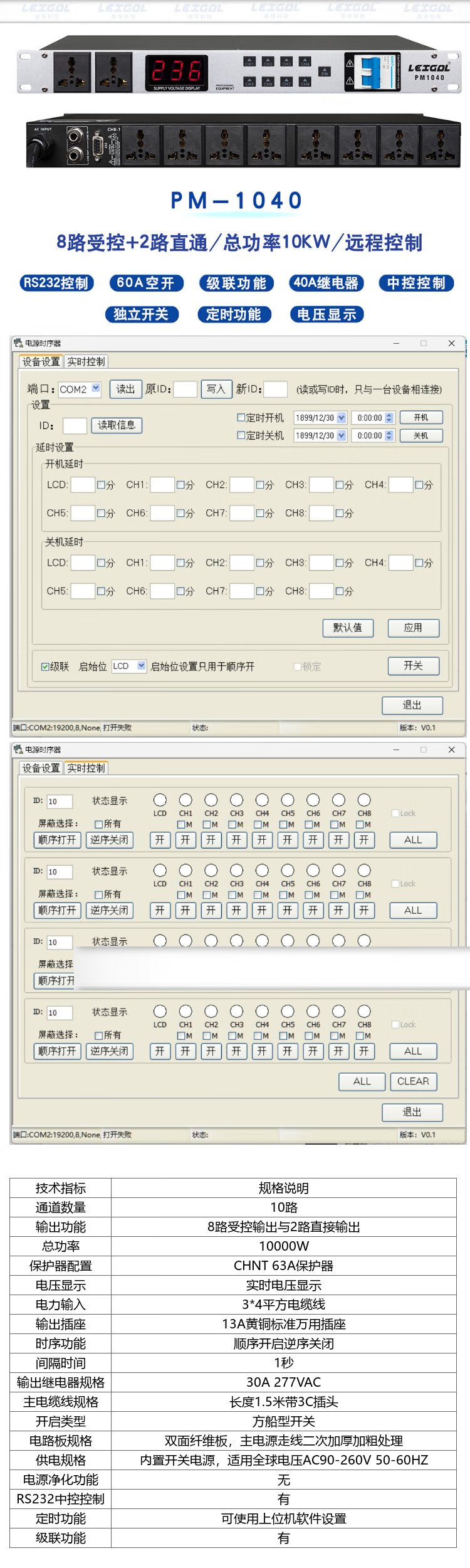 Leijia 10-channel high-power intelligent timing power manager filter timing central control RS232 control with air switch cascadable power supply sequencer PM1040 10-channel 10KW cascade central control timing screen display
