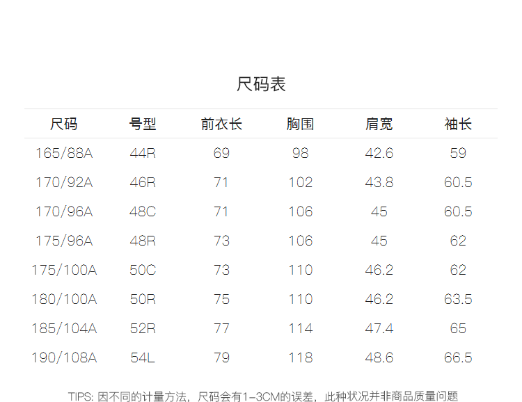 China (cm) 160-165/84-86 165-170 / 88-90 167-172 / 92-96 168-173 / 98-102 170-176 / 106-110