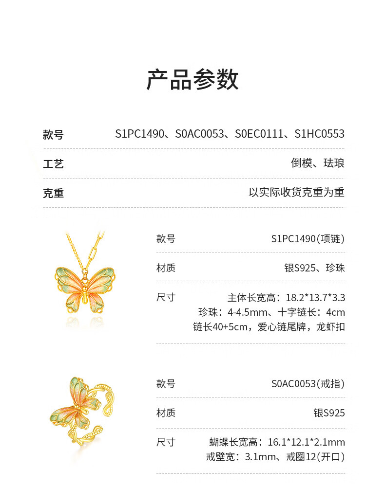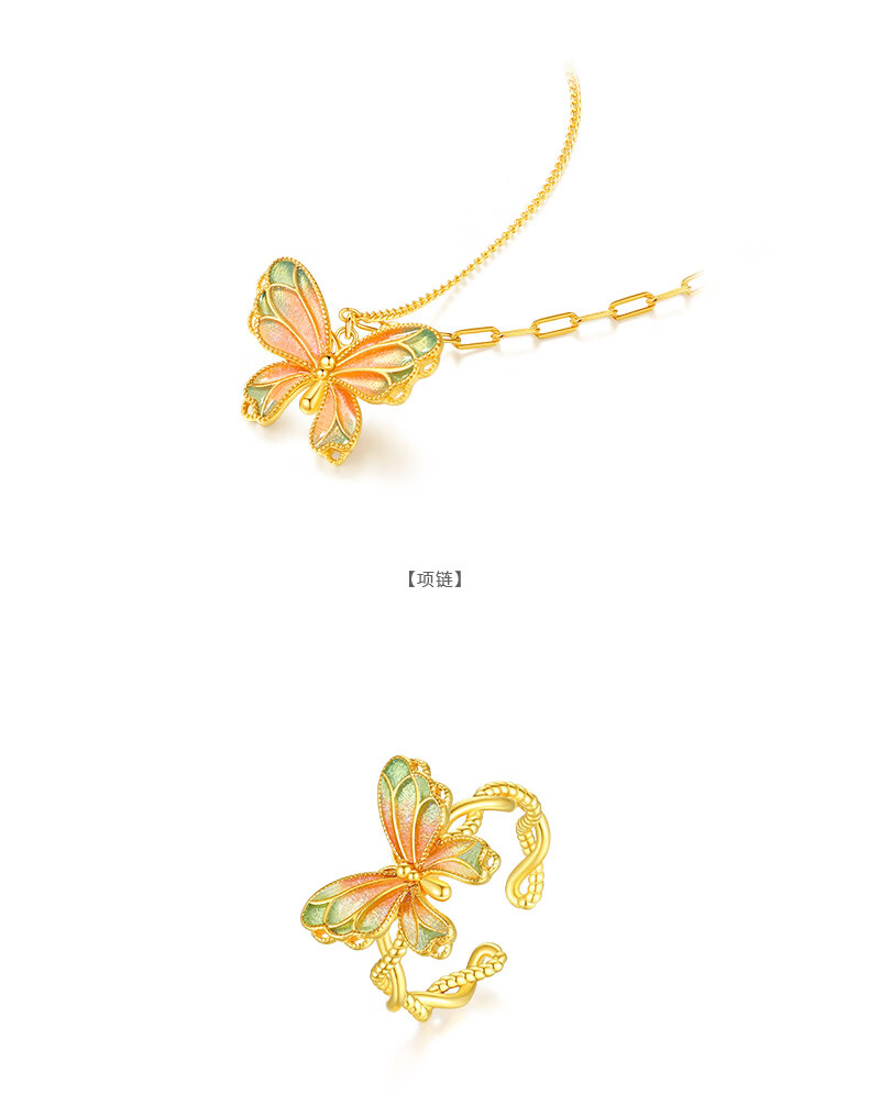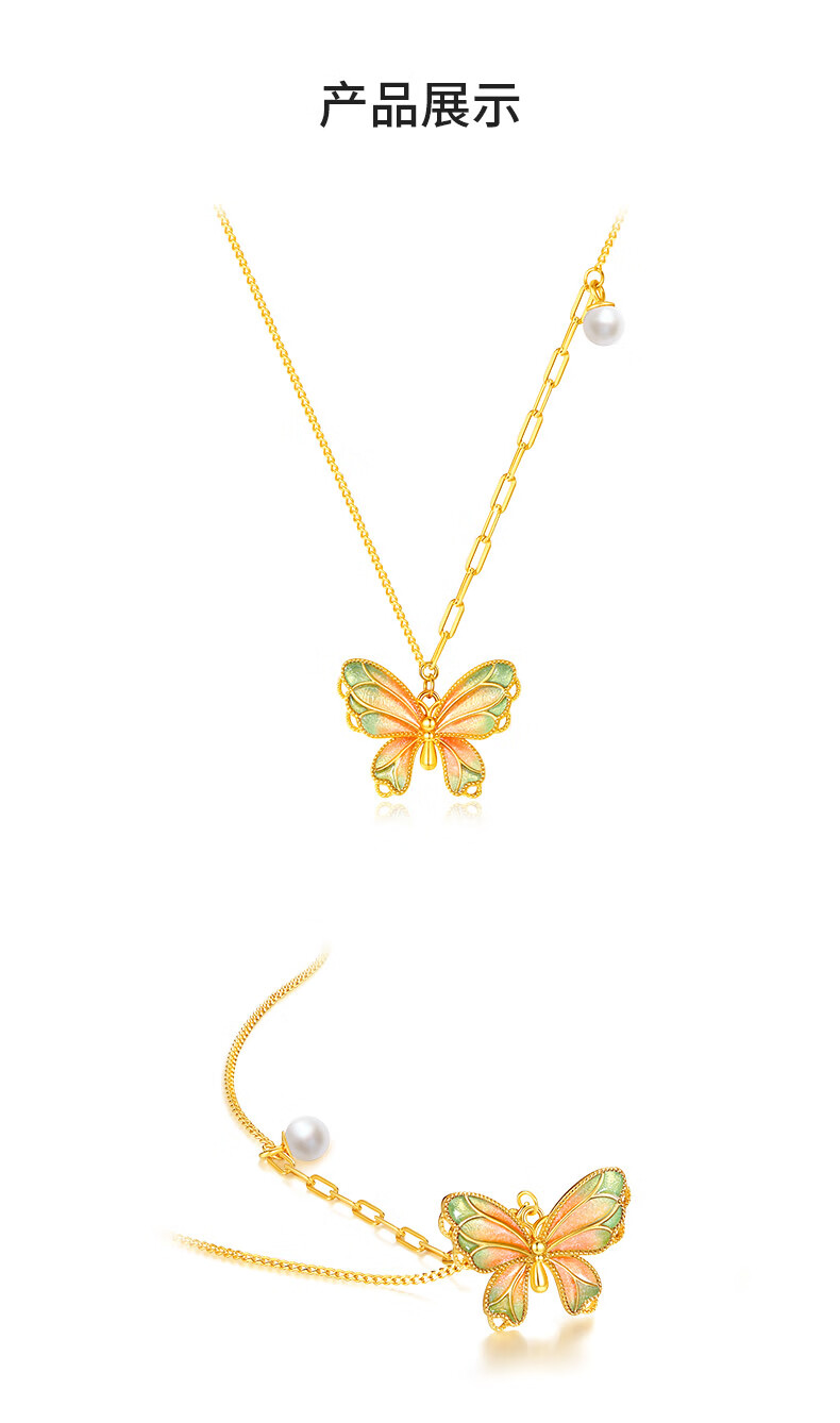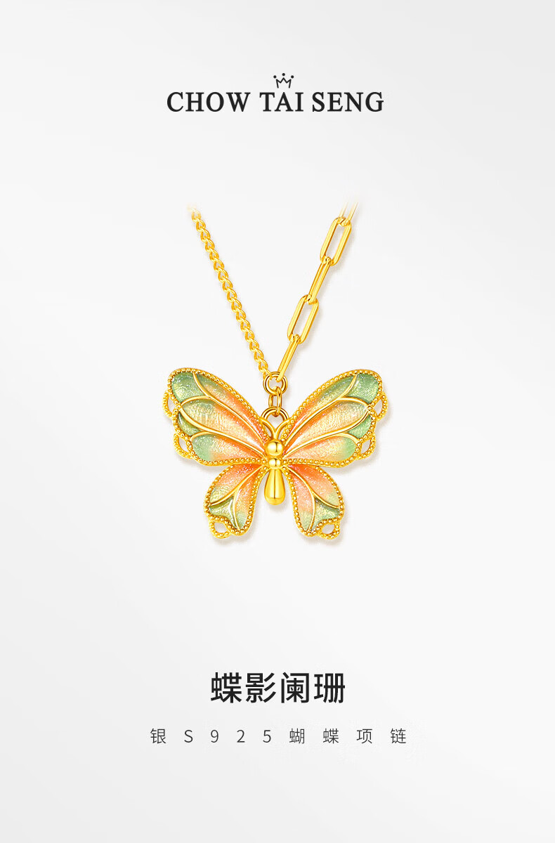 CHOW TAI SENG Butterfly Shadow Silver Sweater Chain Dopamine Gradient Enamel Pearl Necklace Birthday Gift for Girls Pink Green Gradient Silver Necklace