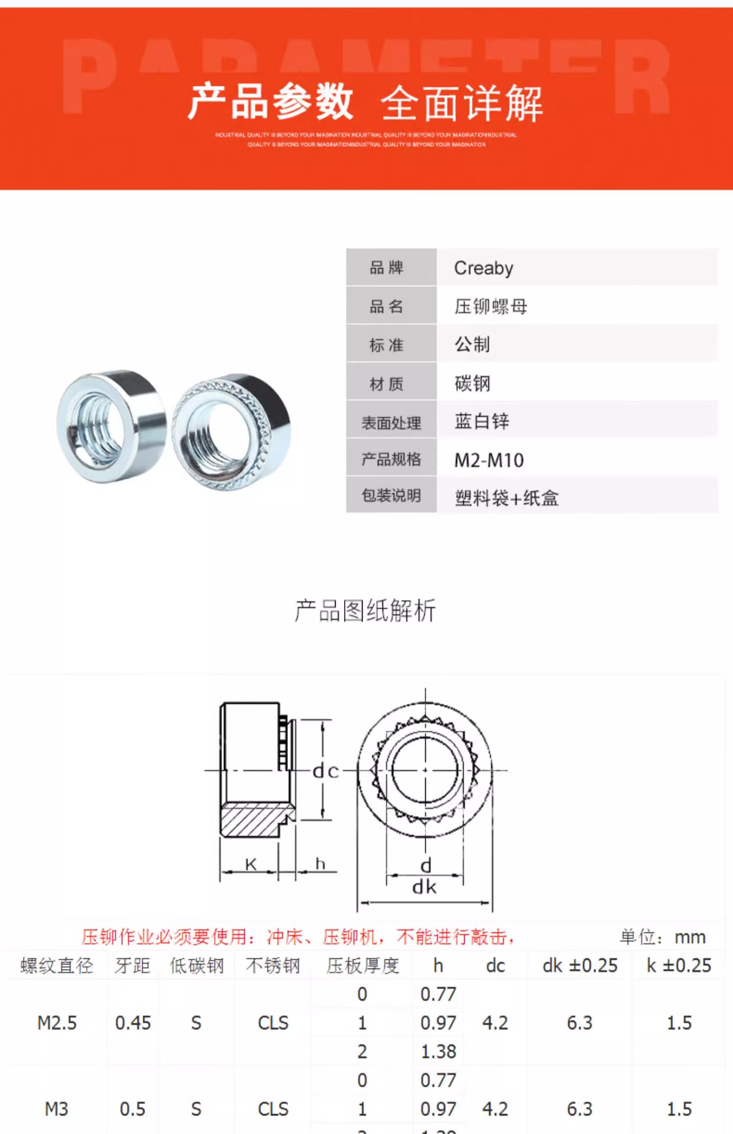 Creaby pressure rivet nut carbon steel galvanized sheet metal pressure rivet piece S pressure rivet round nut pressure plate nut CLS-M8-1 plate thickness 1.4mm 10 pieces