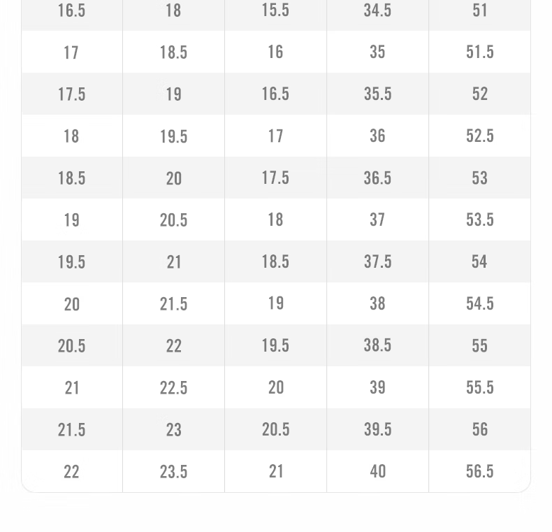 China (cm) 36 - 37 38 - 39 40 - 42 43 - 44 45 - 47