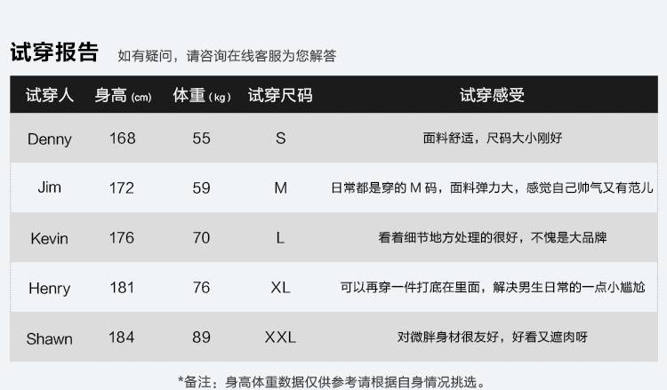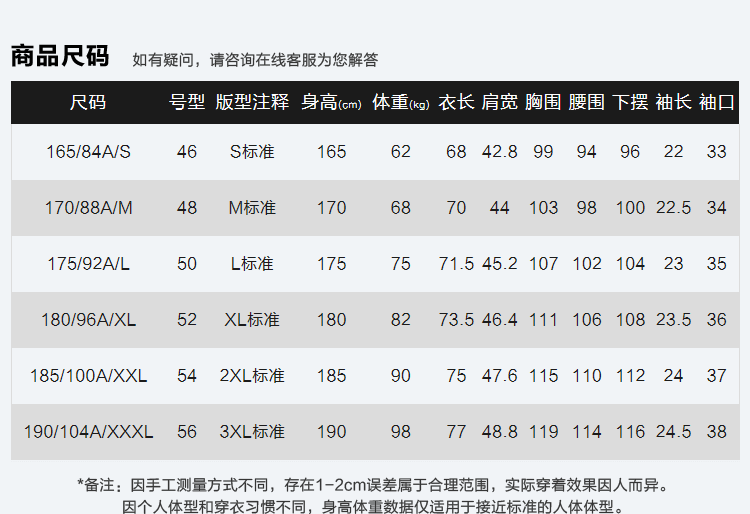 China (cm) 165 / 88-90 170 / 96-98 175 / 108-110 180 / 118-122 185 / 126-130