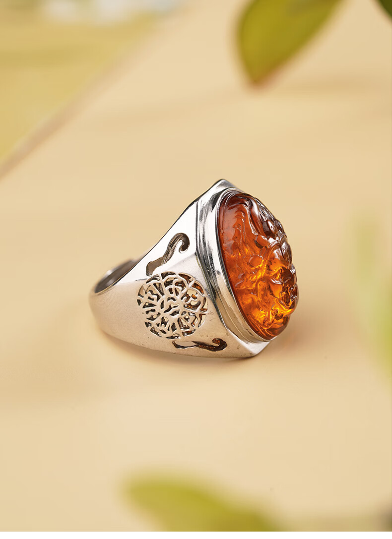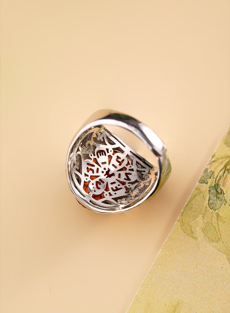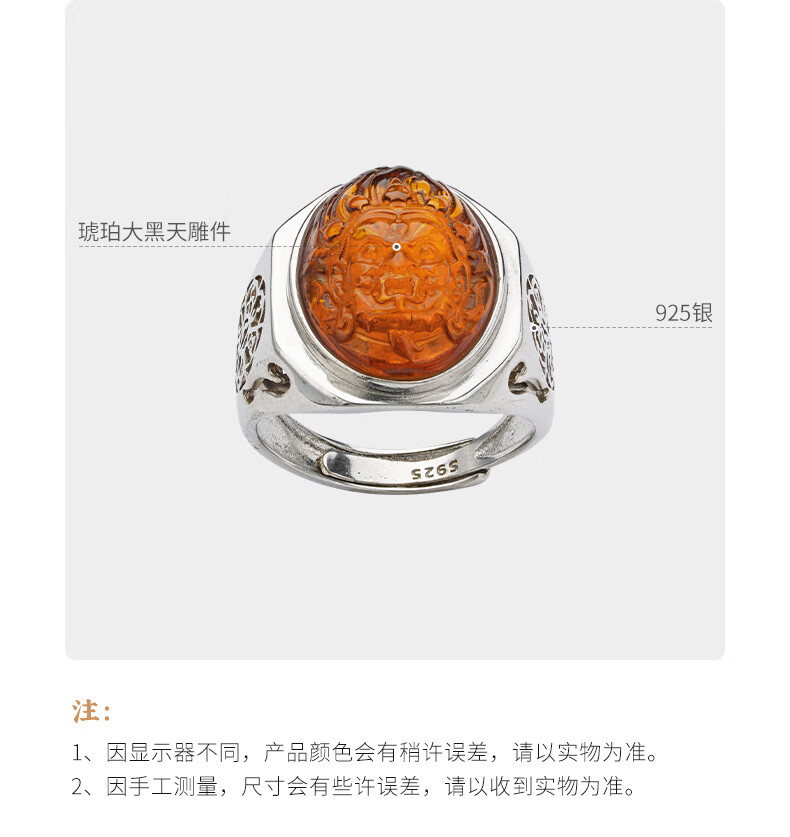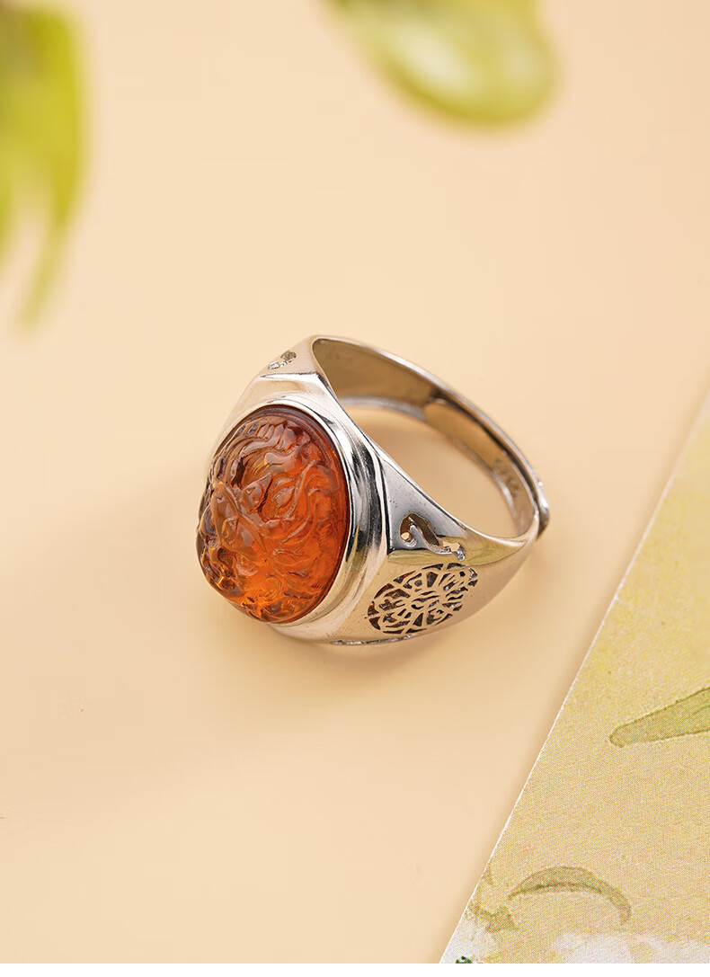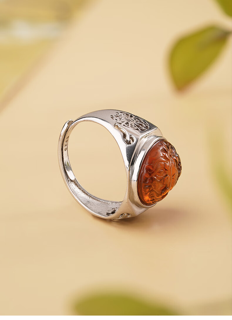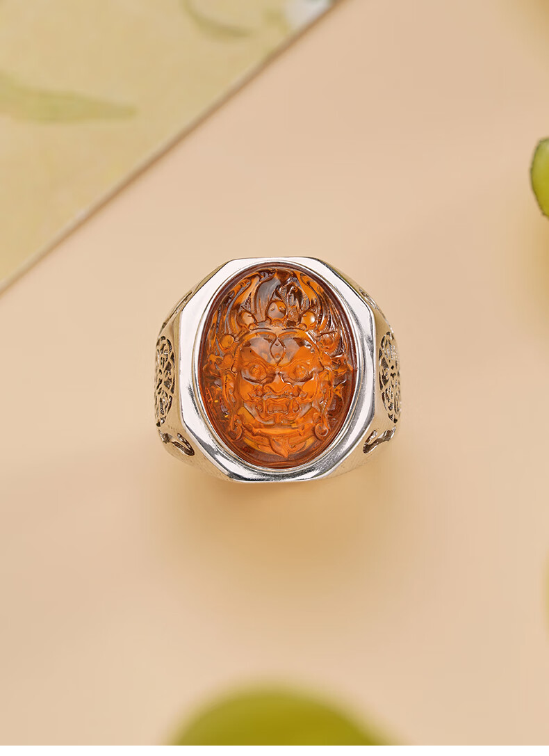 Potala Palace 925 silver ring amber Mahakala ring for men and women Tibetan ethnic style adjustable birthday gift for husband 925 silver inlaid amber Mahakala ring