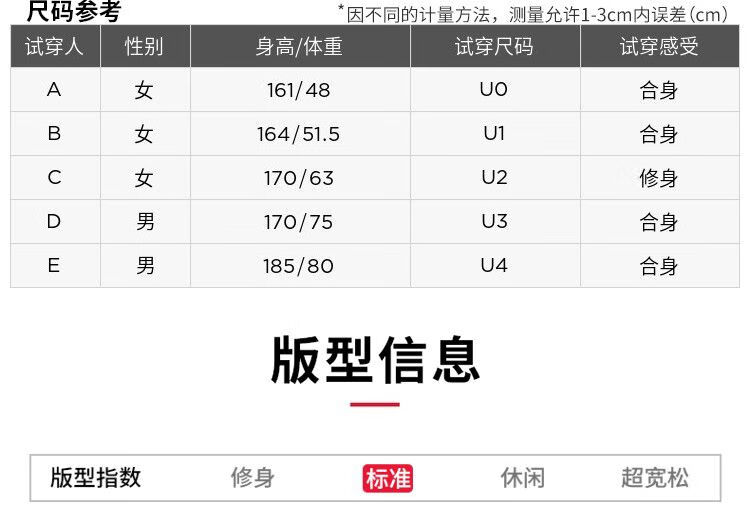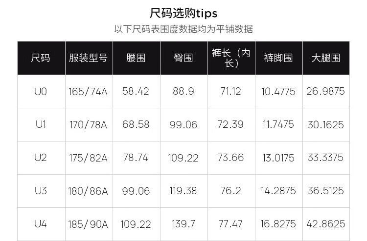 China (cm) 165 / 88-90 170 / 96-98 175 / 108-110 180 / 118-122 185 / 126-130