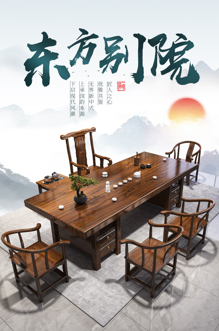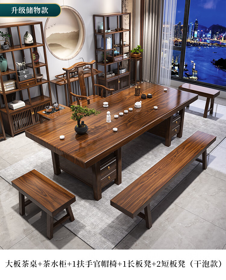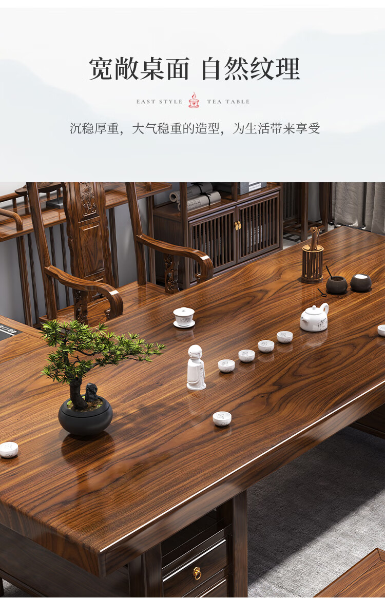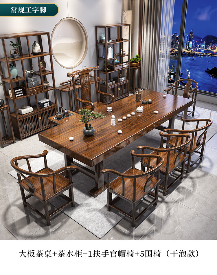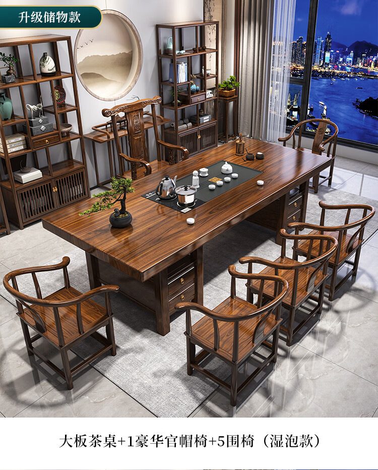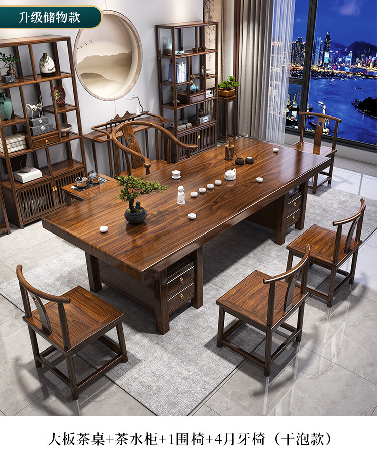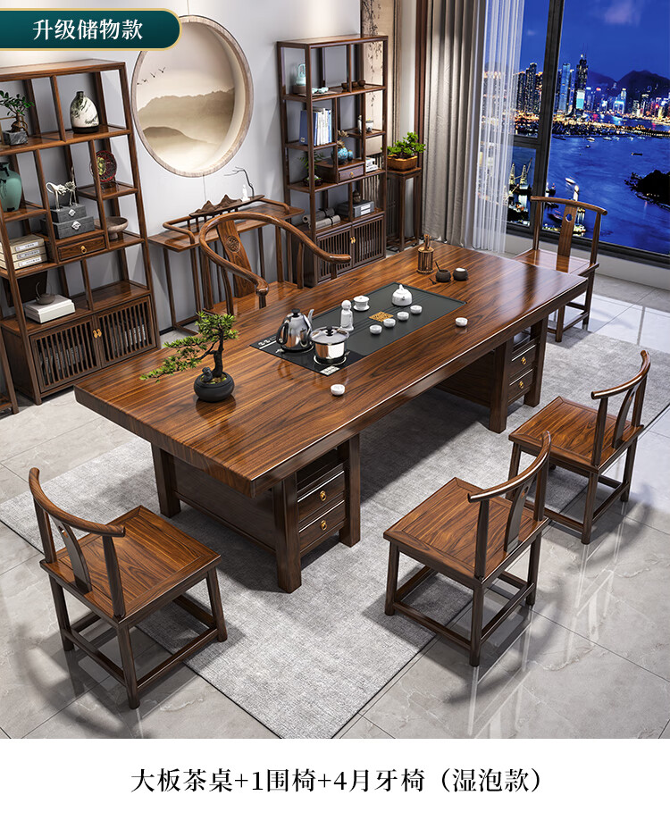 Fangchao solid wood large board tea table and chair combination new Chinese style with kettle for home office Zen Kung Fu tea table stone plate tea table 1 surrounding chair 4 crescent chairs 1.6 meters thickened 7cm desktop