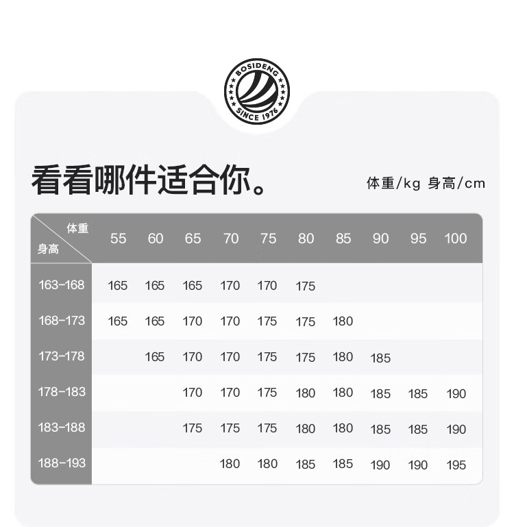 China (cm) 165 / 88-90 170 / 96-98 175 / 108-110 180 / 118-122 185 / 126-130