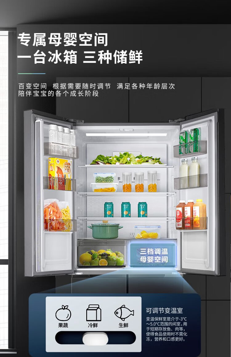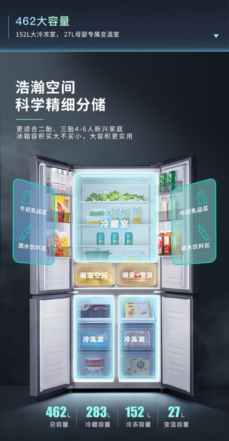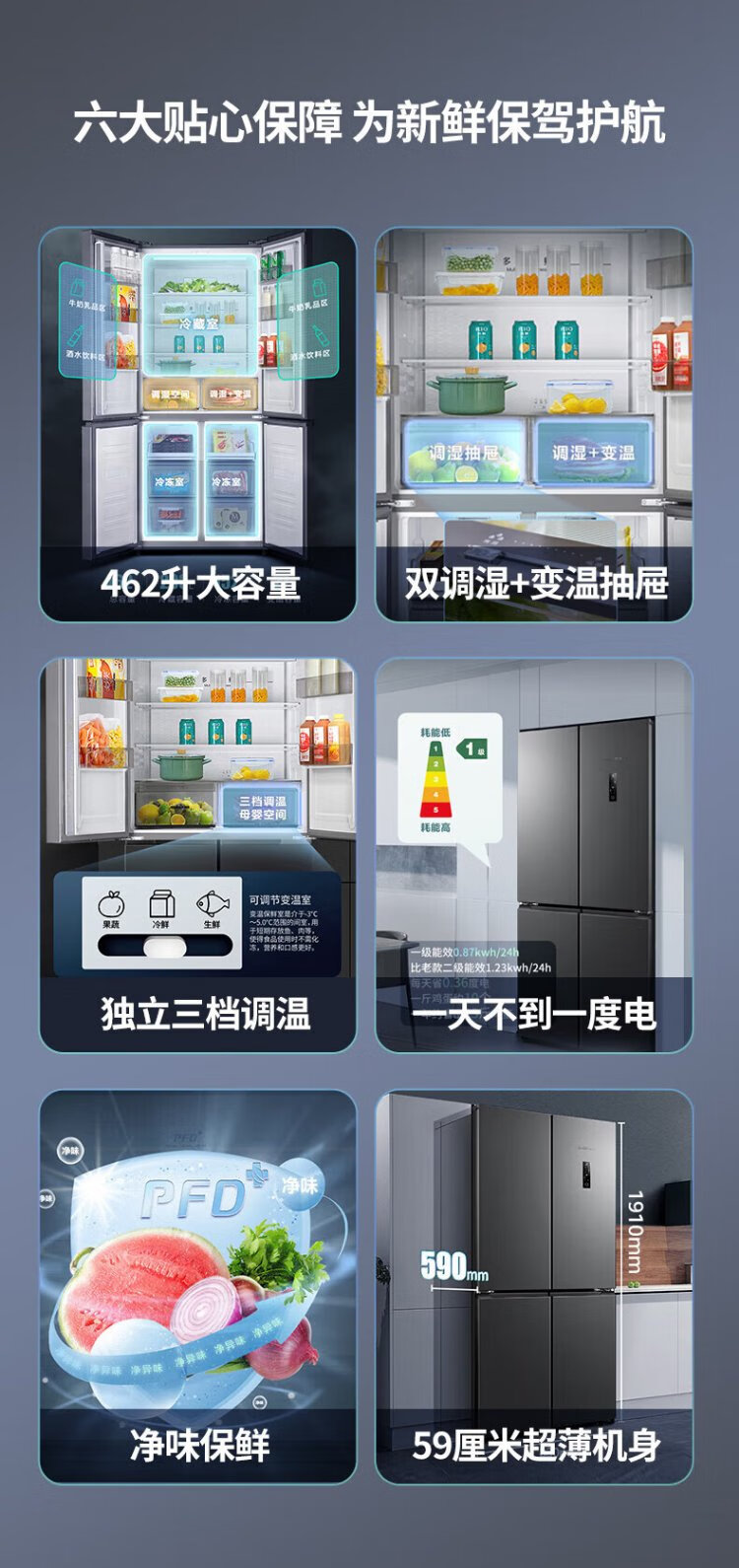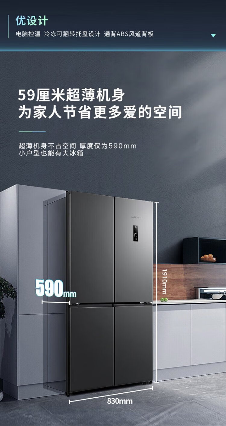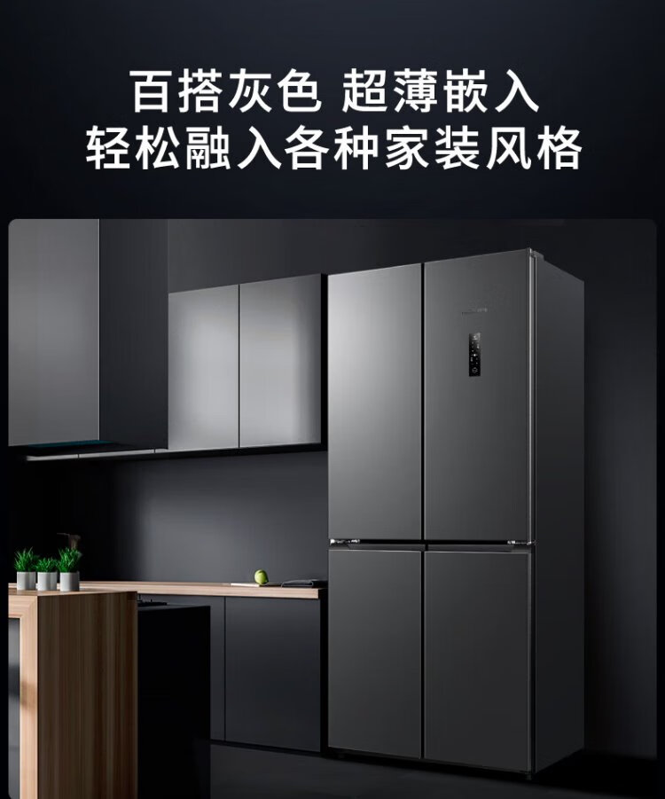 Xinfei Refrigerator 462 liters air-cooled frost-free cross-door refrigerator four-door 59cm ultra-thin and embedded household large-capacity variable frequency first-class energy efficiency energy-saving PFD clean taste and fresh-keeping gray three-speed variable temperature drawer