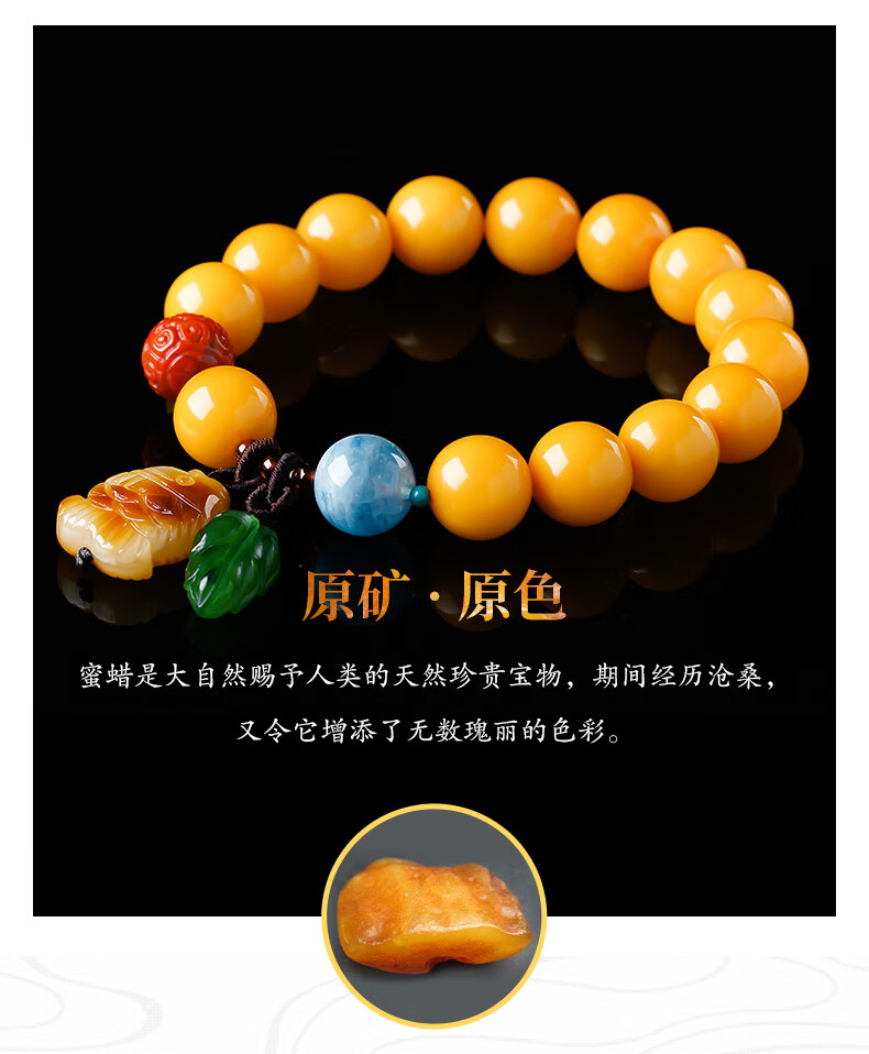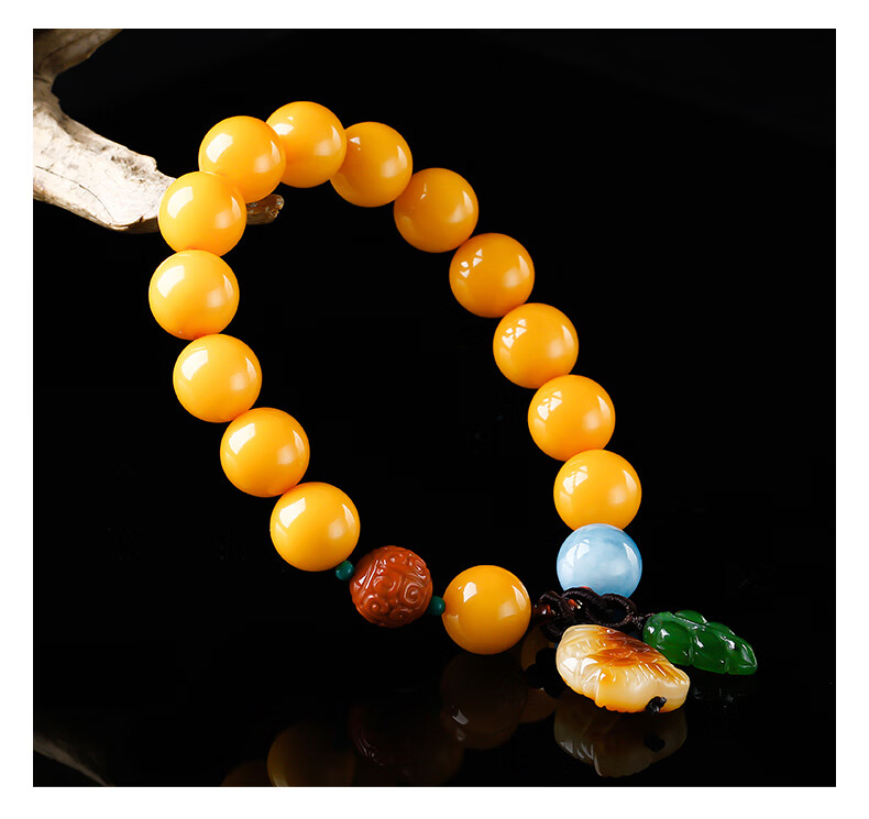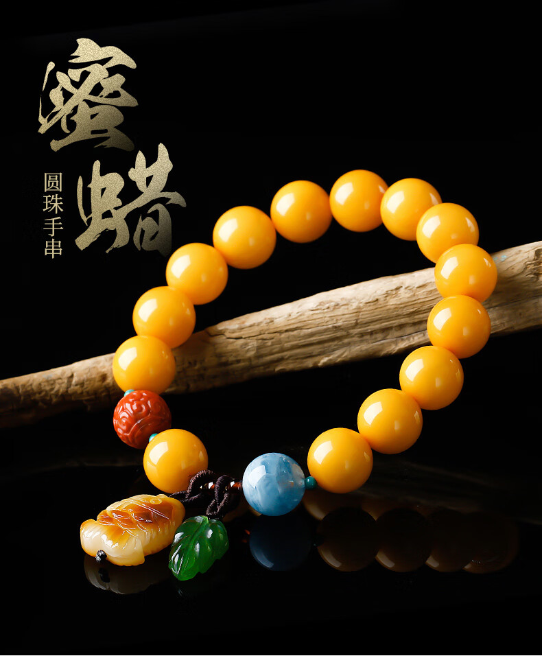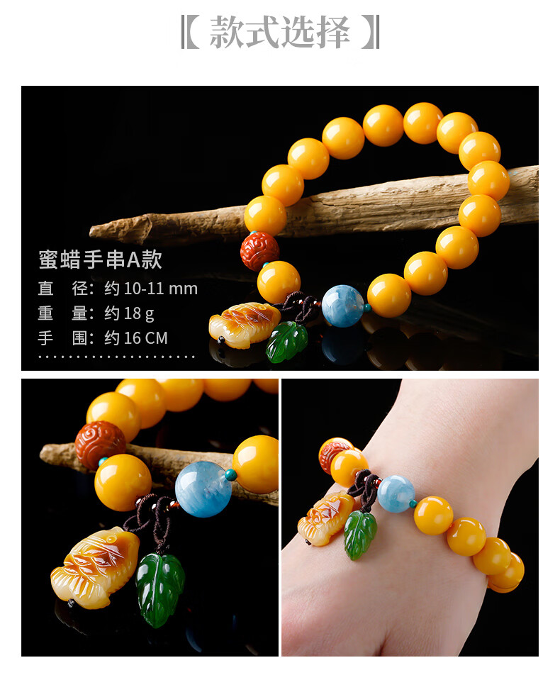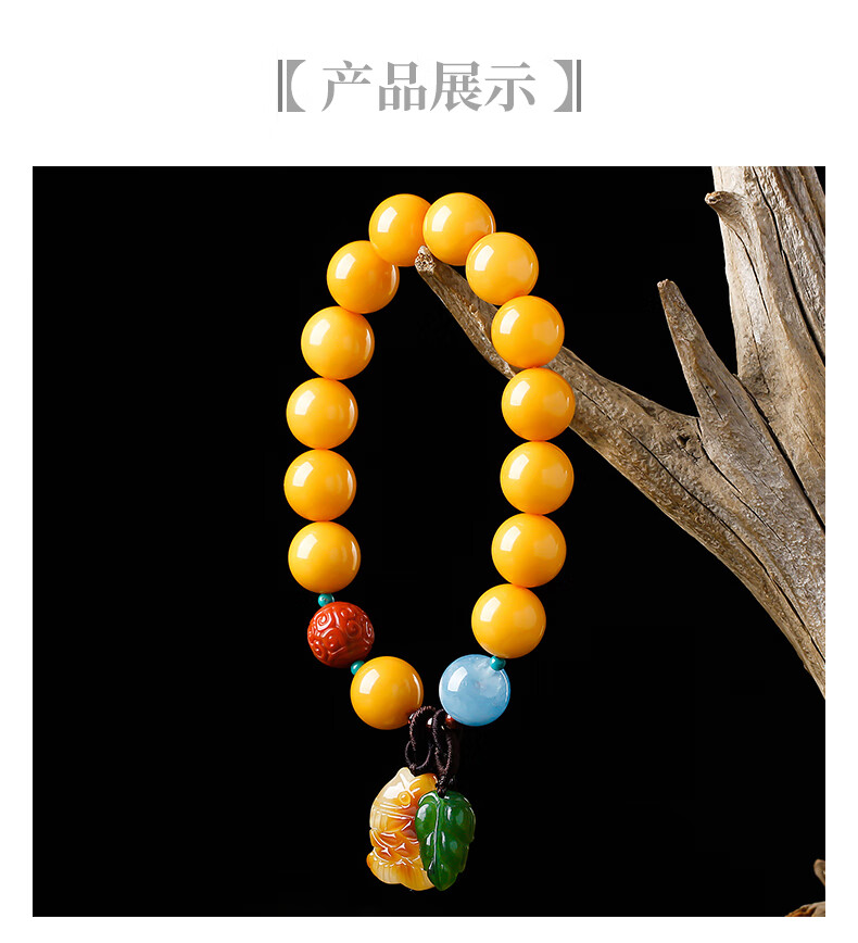 La Yun Feiyin Baltic Sea beeswax bracelet natural amber chicken fat yellow round bead bracelet beeswax fish pendant with jasper jade leaves Type A fish with jasper jade leaves