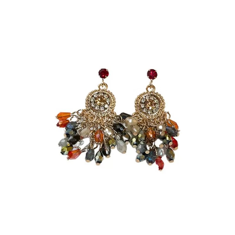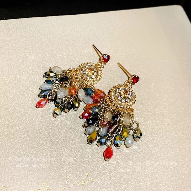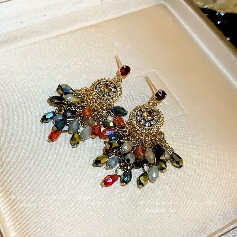 Jianla Super Fairy Colored Crystal Tassel Earrings Retro Exaggerated Ethnic Style Niche Design Bohemian Earrings for Women Colorful Heavy Industry Tassel Earrings A07-204