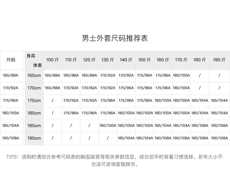 China (cm) 165 / 88-90 170 / 96-98 175 / 108-110 180 / 118-122 185 / 126-130