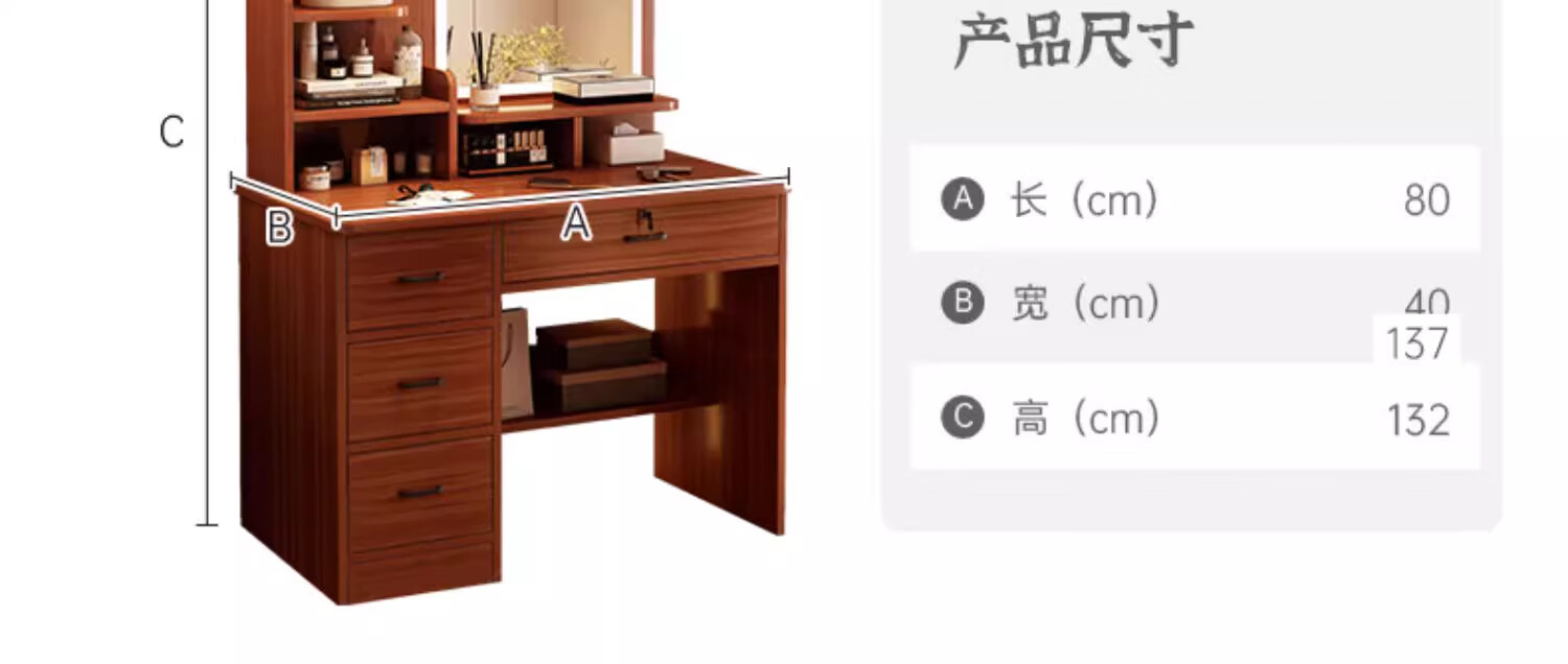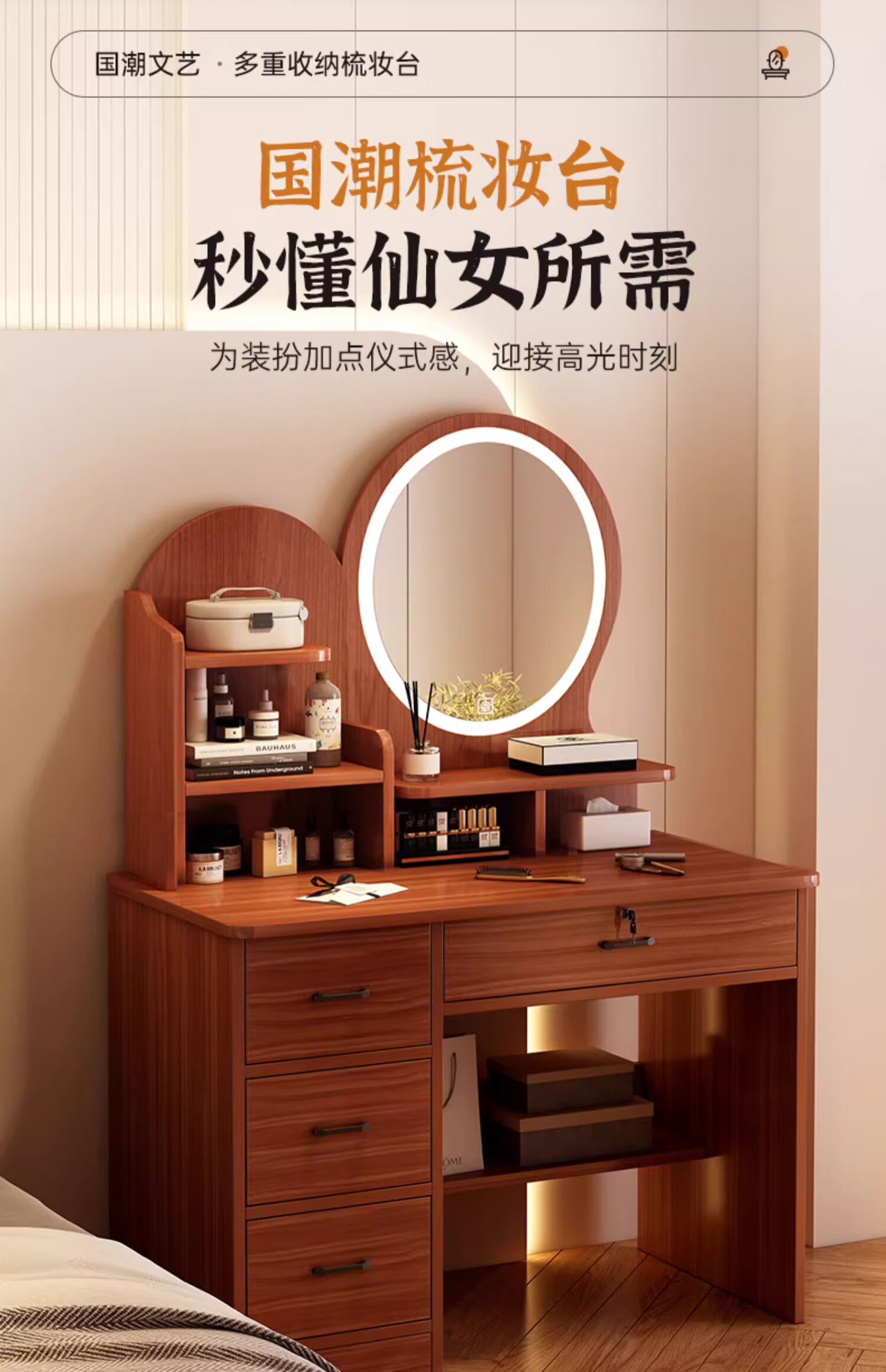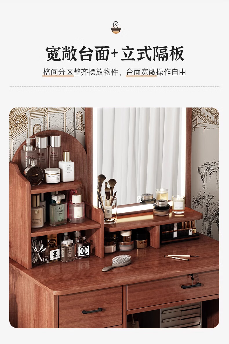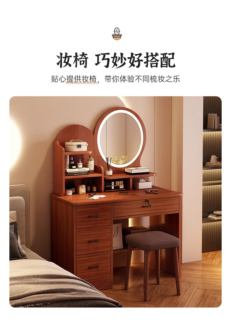 LOVEHOODCAT Dressing Table Bedroom Dressing Table and Cupboard Integrated 2025 New Storage Mirror Bedroom Light Luxury High-end Dressing Table Bonus ~ Free Dressing Stool | Ancient Sandalwood Color Four-drawn Round Mirror