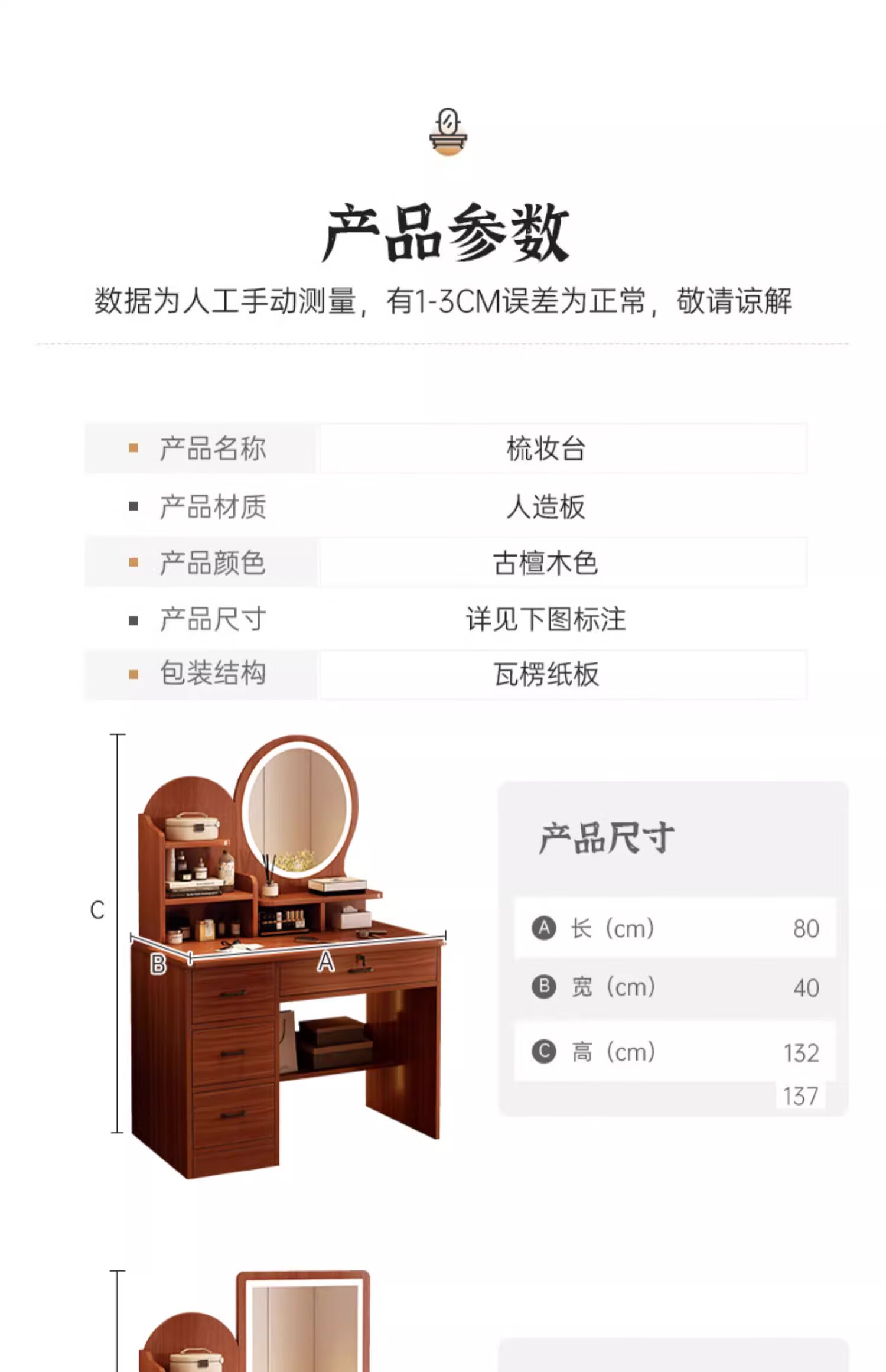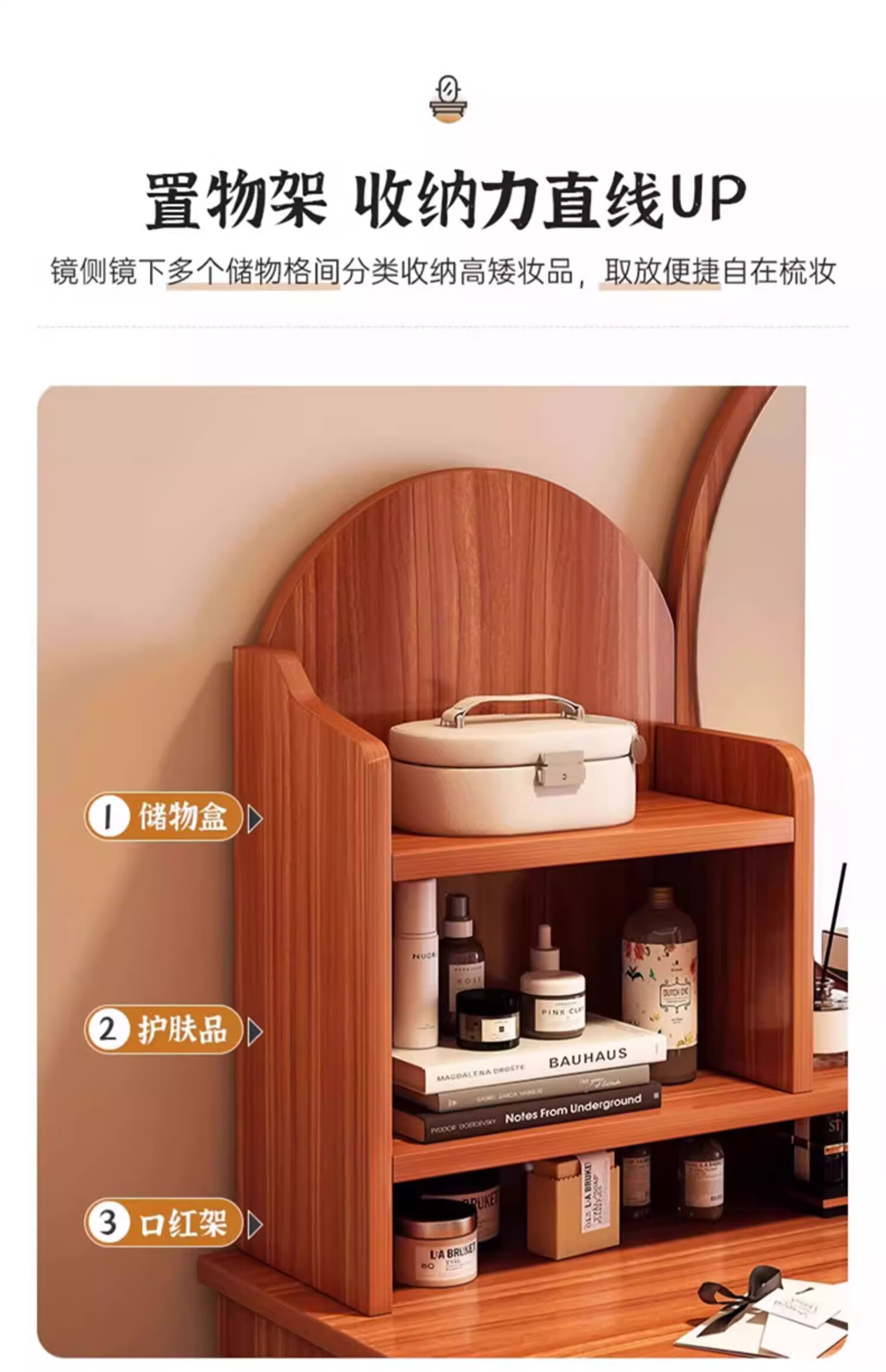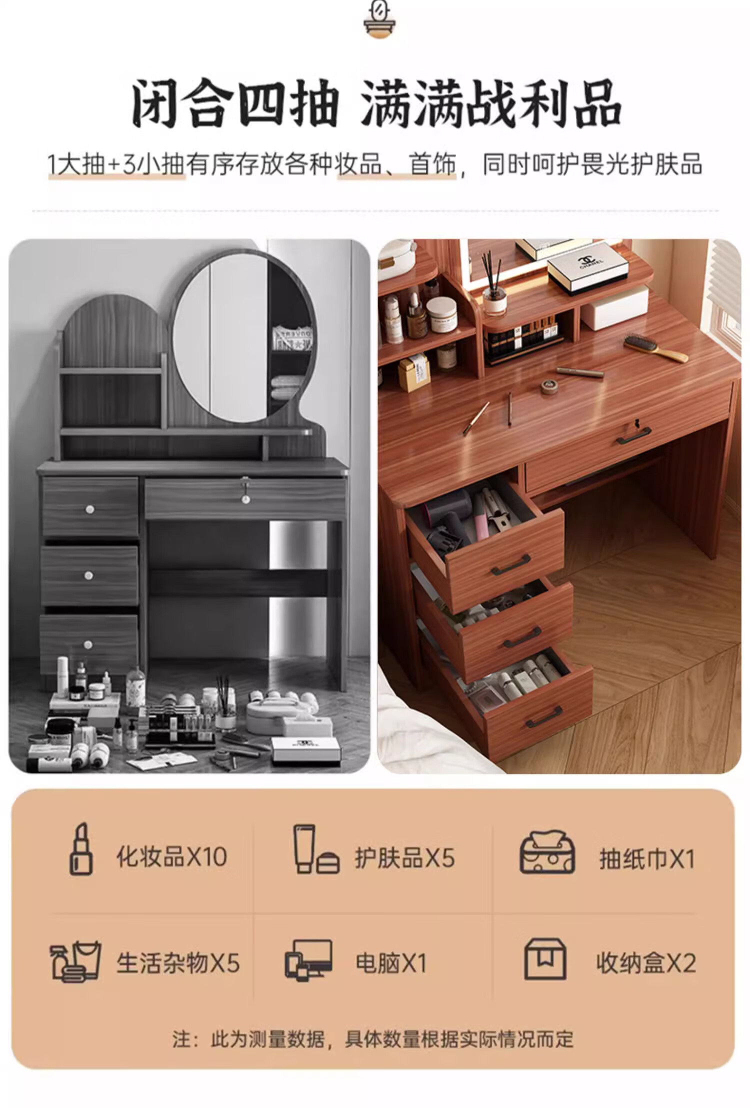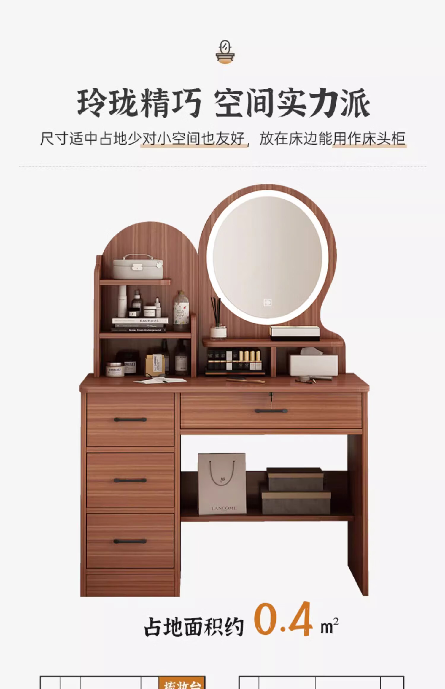 LOVEHOODCAT Dressing Table Bedroom Dressing Table and Cupboard Integrated 2025 New Storage Mirror Bedroom Light Luxury High-end Dressing Table Bonus ~ Free Dressing Stool | Ancient Sandalwood Color Four-drawn Round Mirror