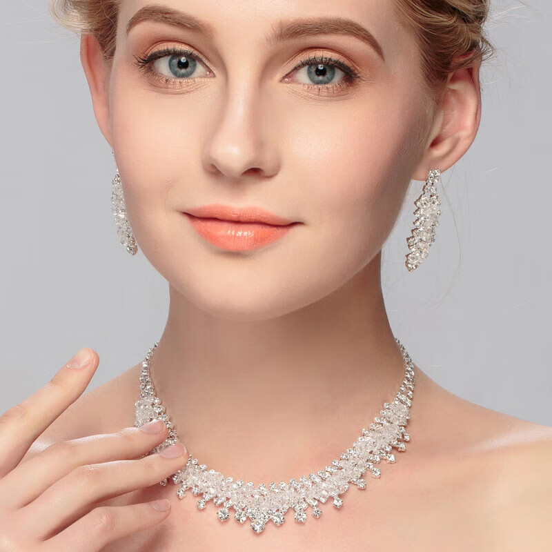 SHIJUN European and American bridal wedding dress necklace earrings set two-piece fashionable crystal clavicle chain female banquet dress accessories