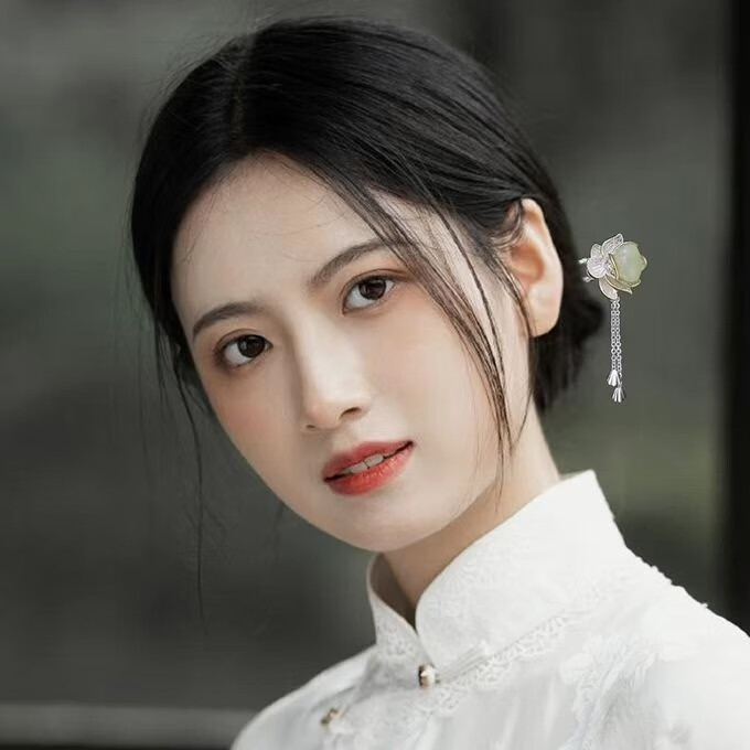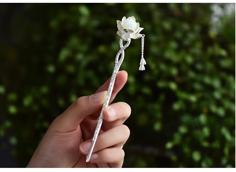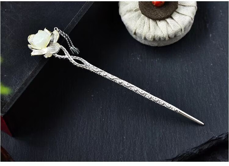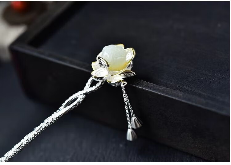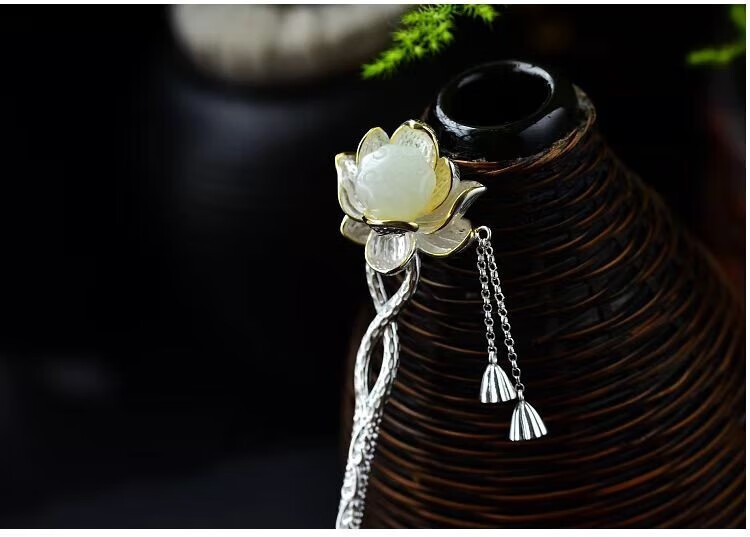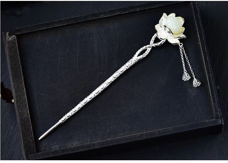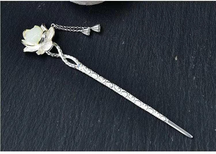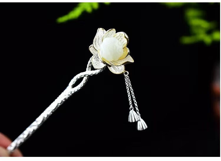 KERLAS925 Silver Ancient Style Hetian Jade Lotus Hairpin and Hairpin Gift Hairpin Step Shake Tassel Hanfu Hairpin Versatile Large Lotus Seed Step Shake Hairpin (White Jade) + High-end Gift Box (