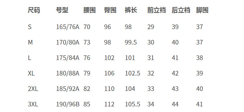 China (cm) 160-165/84-86 165-170 / 88-90 167-172 / 92-96 168-173 / 98-102 170-176 / 106-110