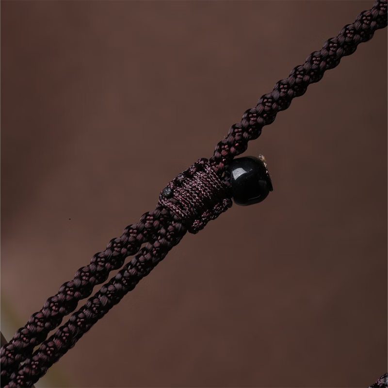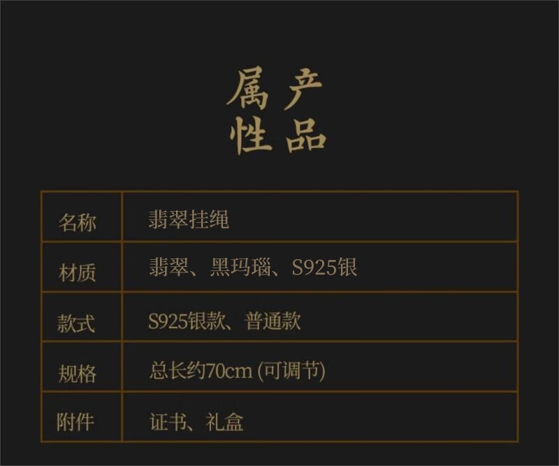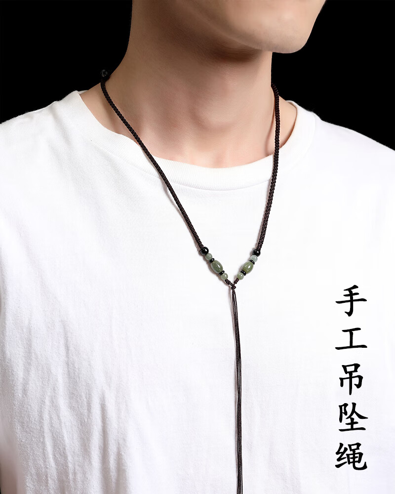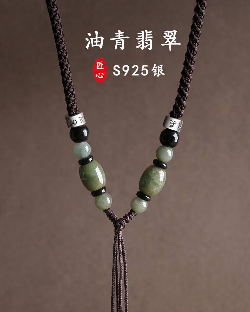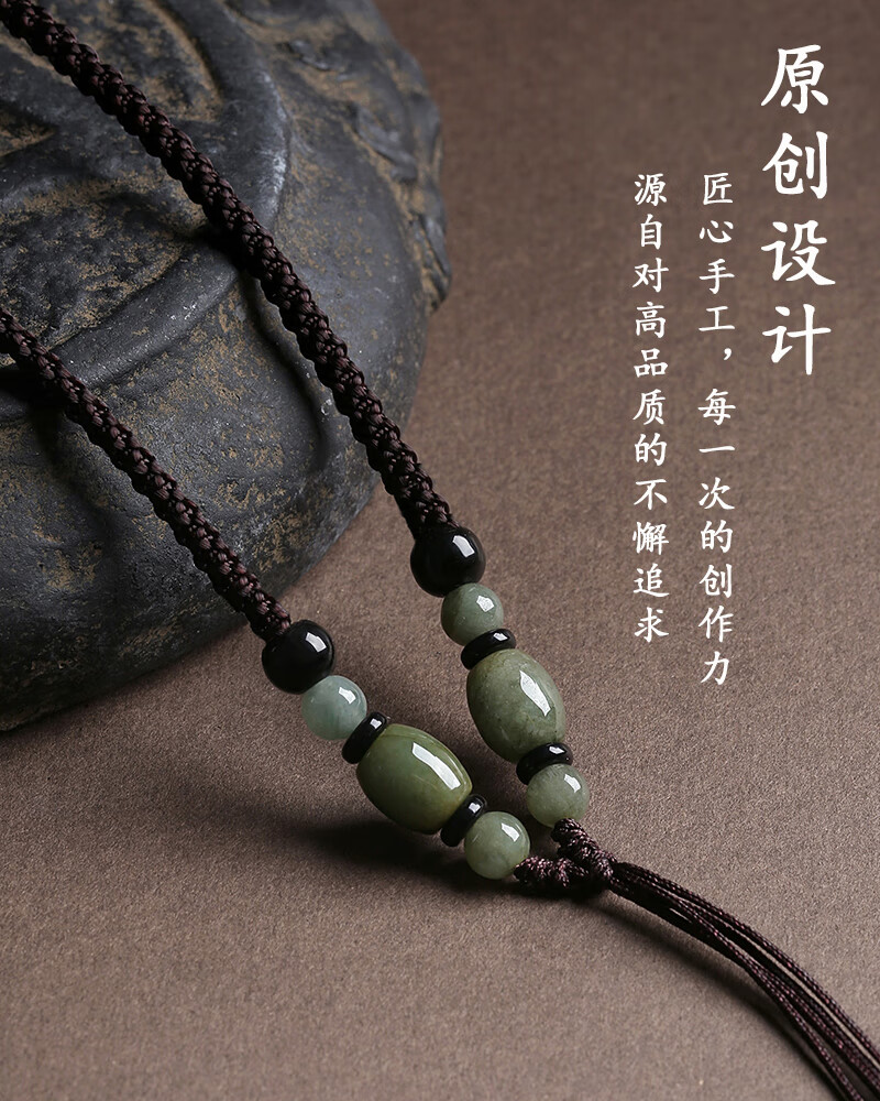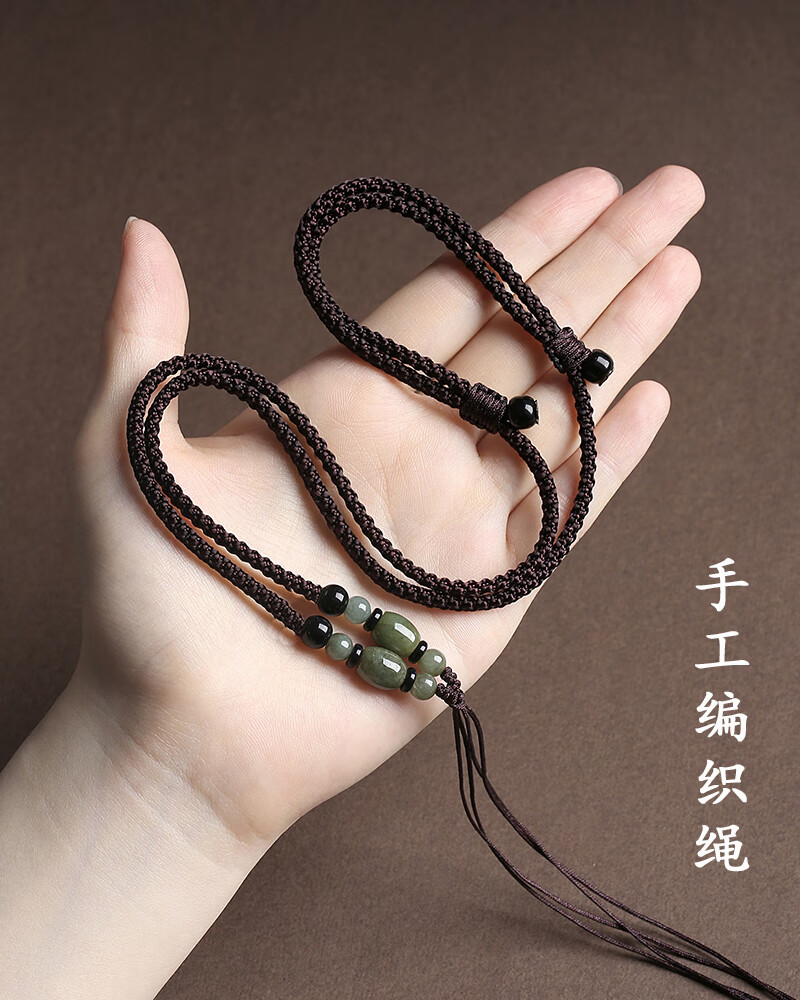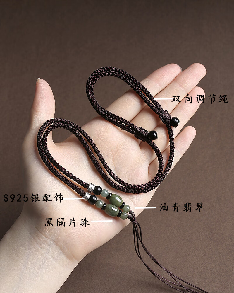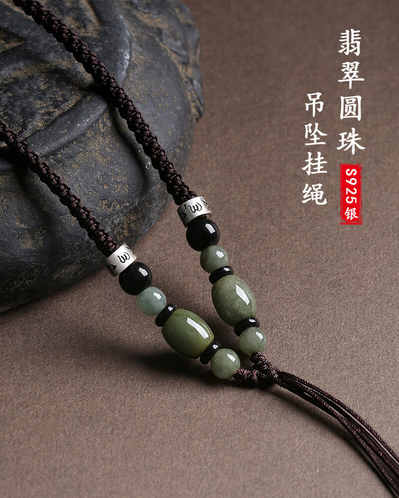 Dingjing S925 silver pendant lanyard hand-woven jadeite black agate necklace rope pendant rope safety buckle jade pendant Buddha plate Jadeite (round) + black agate + brown rope (silver)