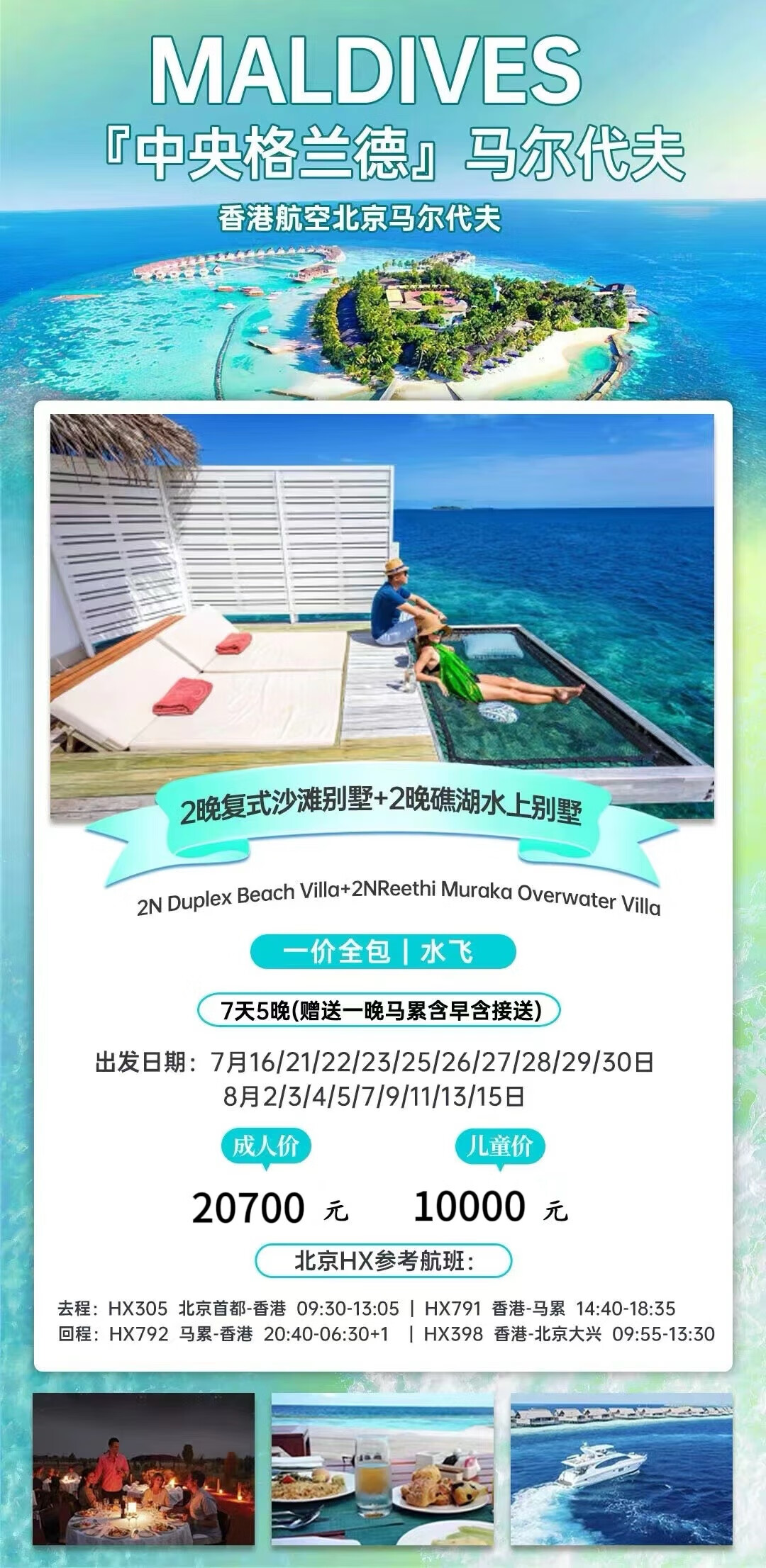 Including air tickets, Maldives Central Grande 2 sand and 2 water, 7 days and 5 nights (including 1 night accommodation in Male), starting from Beijing, adults