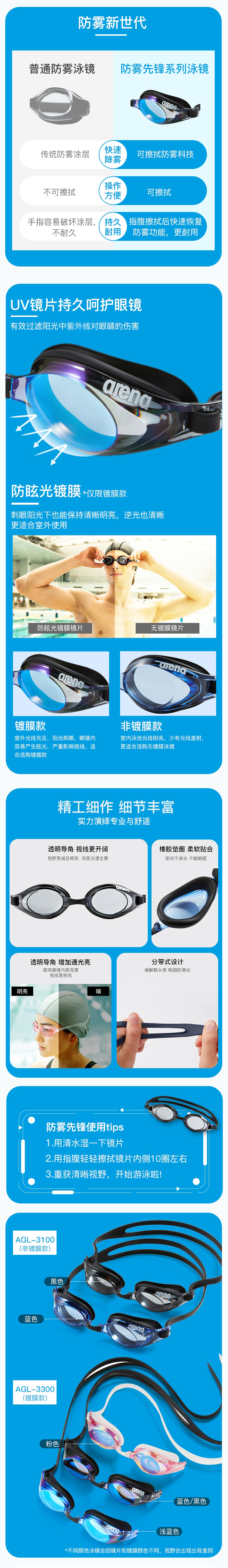 Arena imported swimming goggles for men and women, anti-fog pioneer, wipeable, upgraded, anti-fog, high-definition, waterproof, large frame, comfortable swimming goggles, blue/black - coated (3300ME-BSK), flat