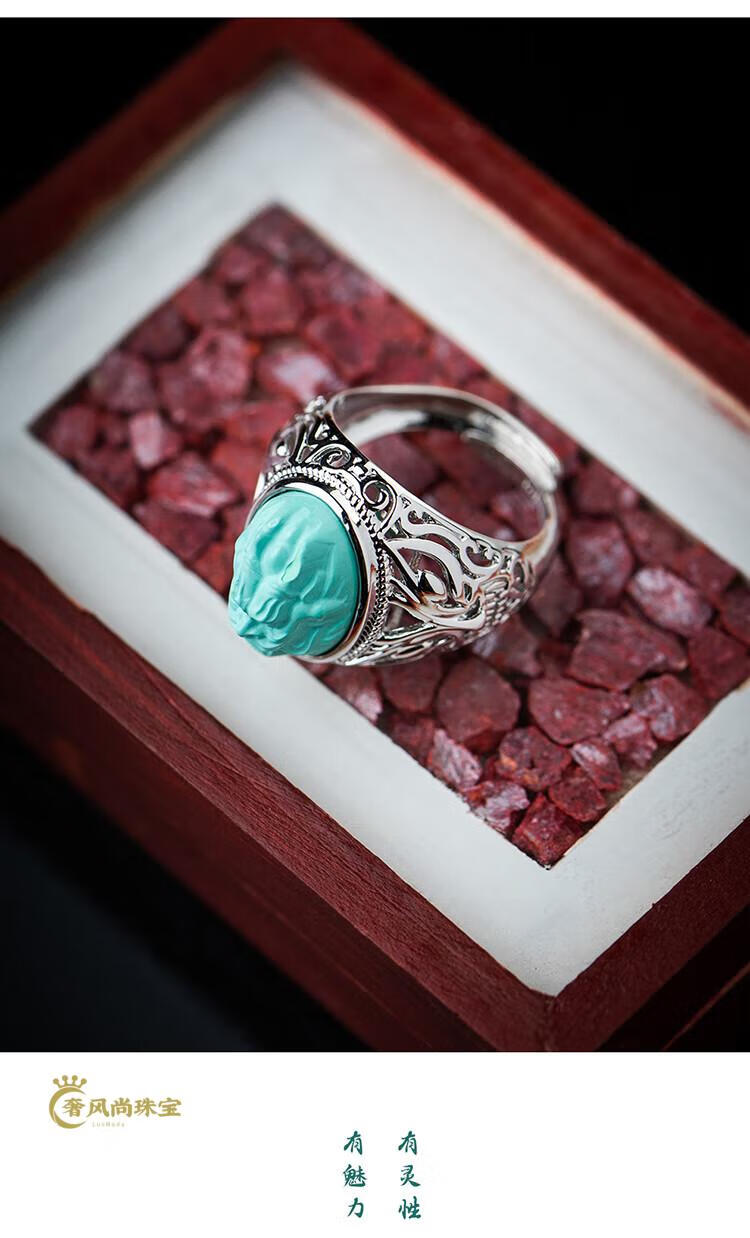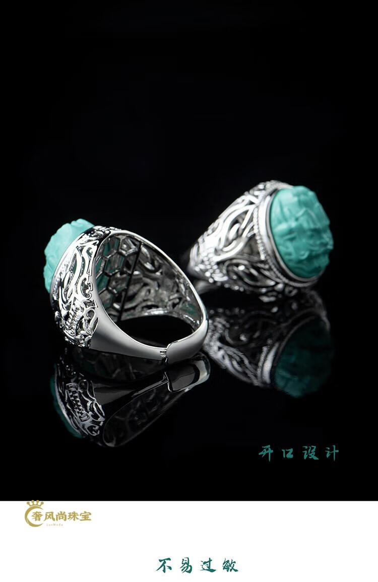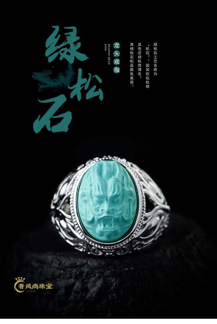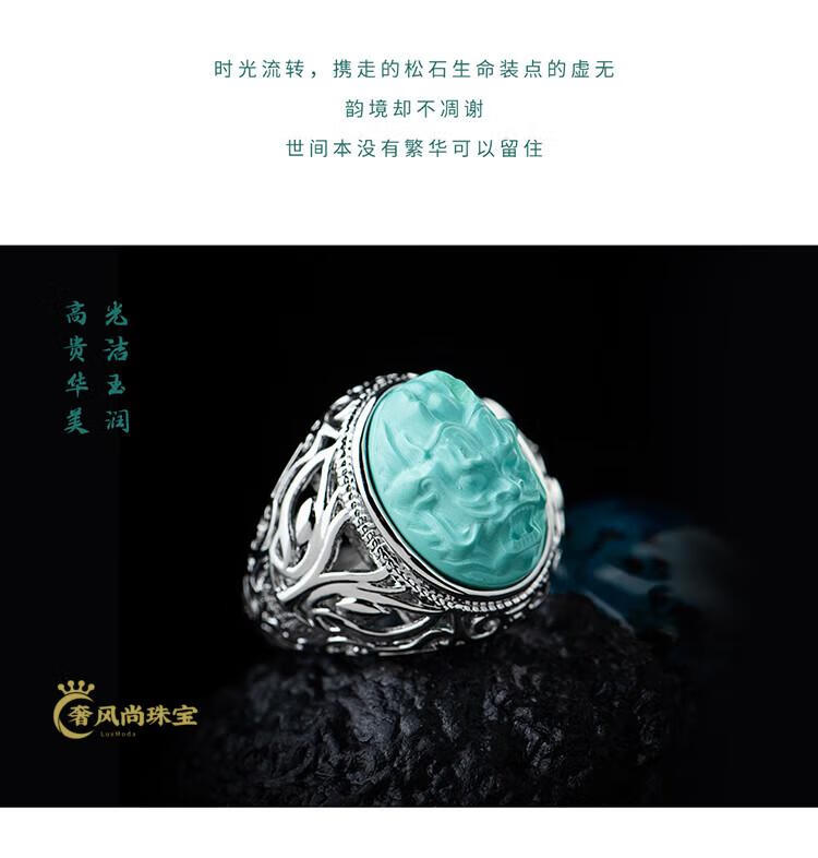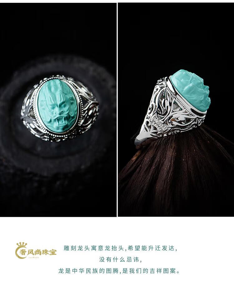 Fat Donglai's same style men's turquoise ring raw ore high porcelain silver women's domineering carved dragon head zodiac dragon ring without engraving pattern - silver holder style random