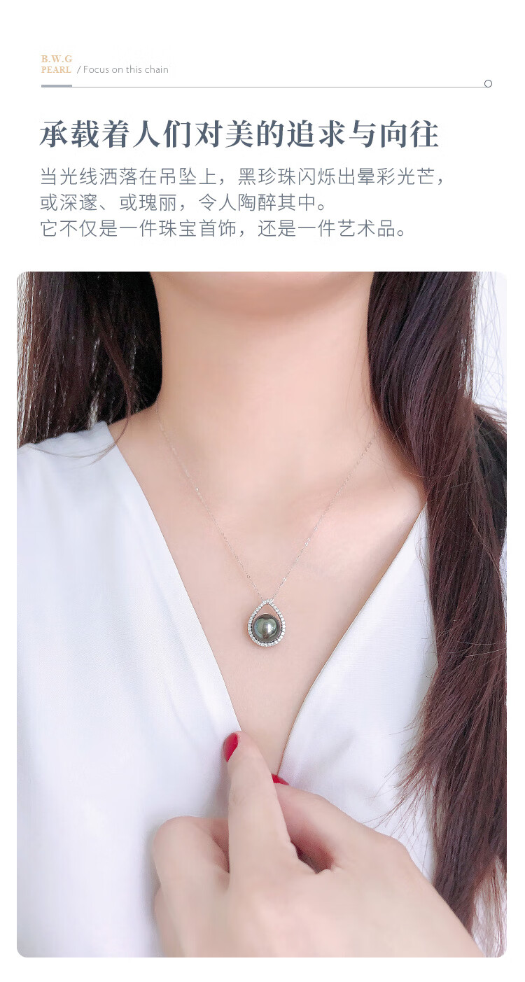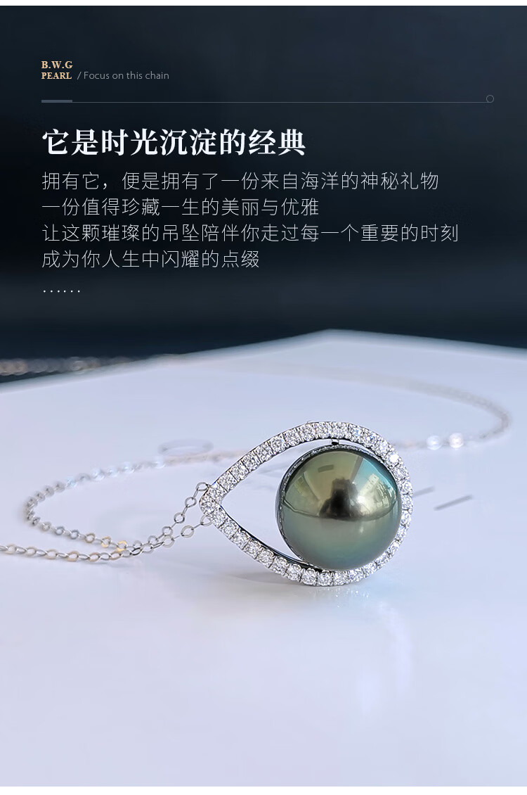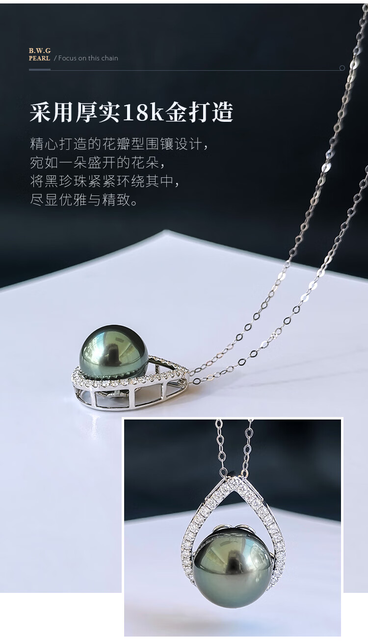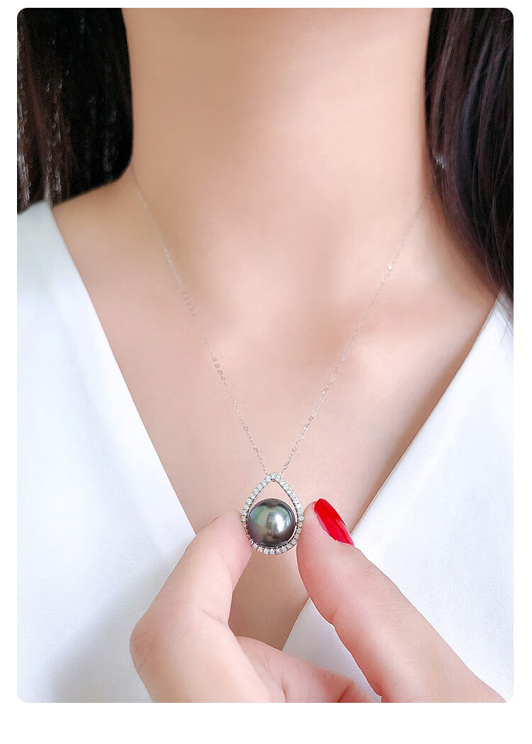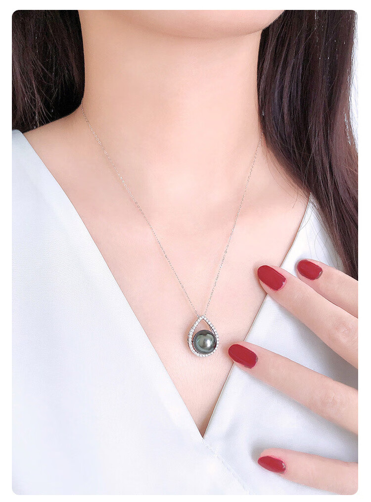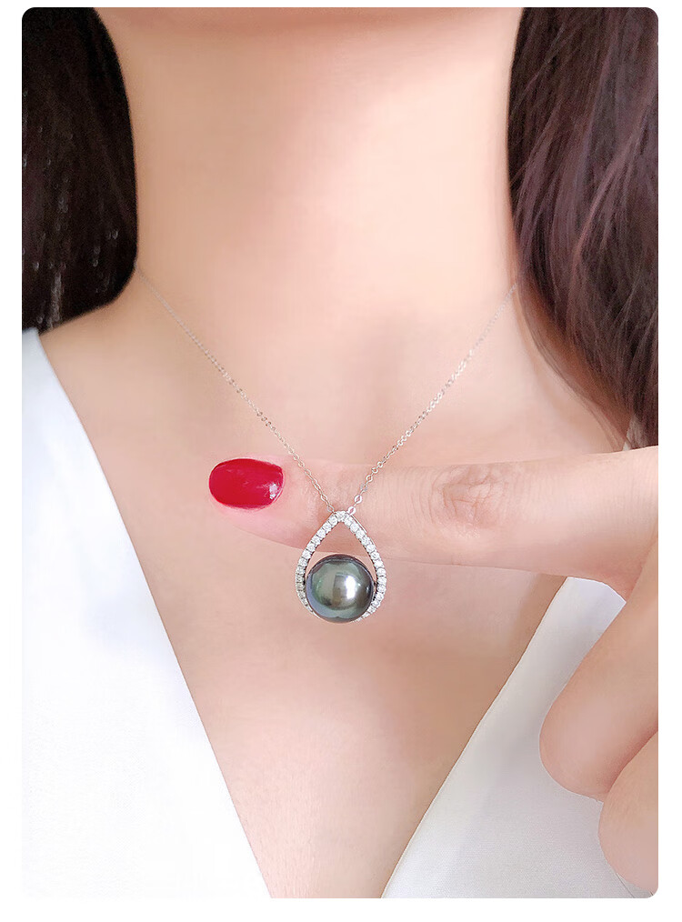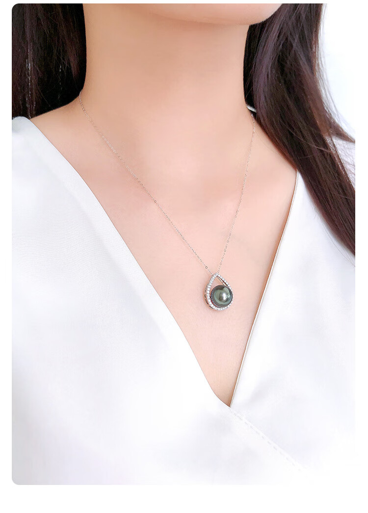 Black and white gold pearl seawater Tahitian black pearl 18K gold inlaid diamond pendant single black bead temperament chain birthday gift for others 11~12mm