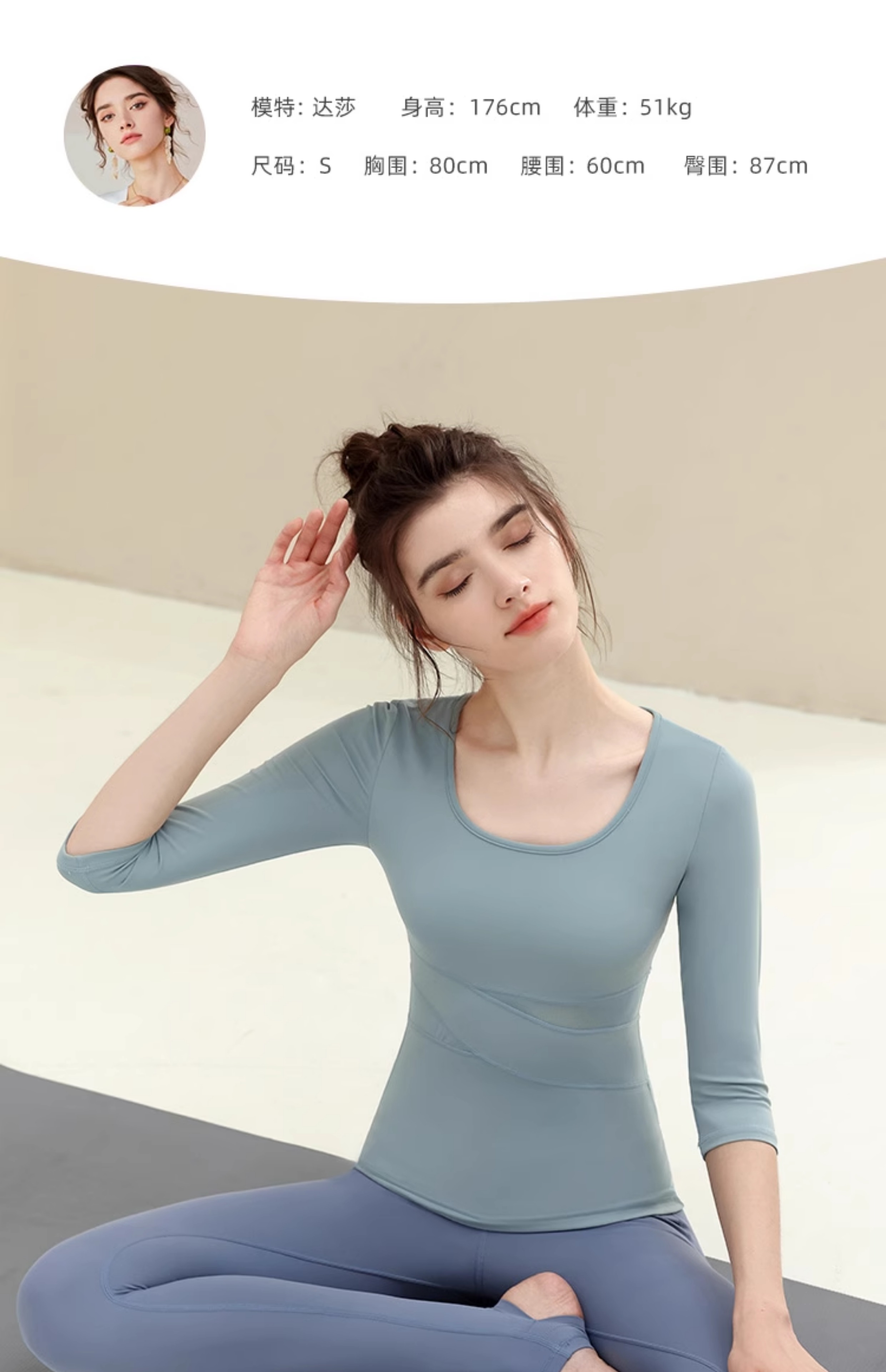 Shuangxiu yoga clothing top for women, high-end three-quarter sleeves with chest pad, fashionable and professional Pilates training sports fitness suit, mint blue top L(110-120)
