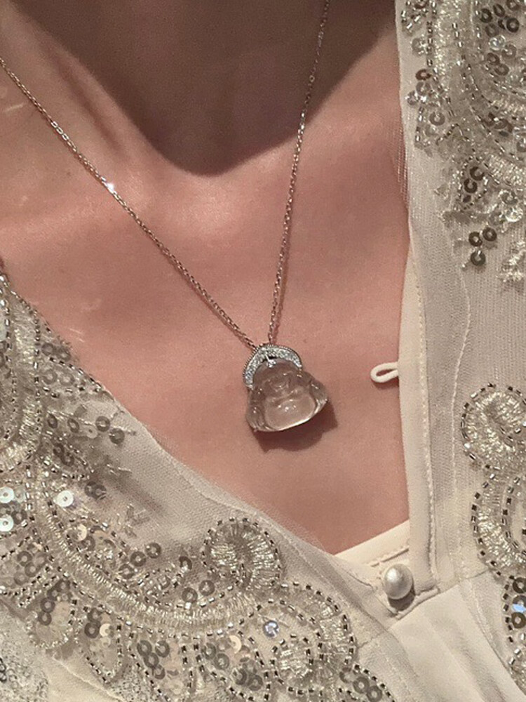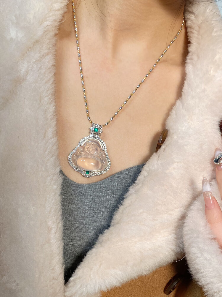 SGE Chalcedony Buddha Necklace for Women with Big Belly Maitreya Buddha Pendant New Chinese Style Clavicle Chain as a Gift for Mom in the Year of the Snake. Chalcedony Buddha Necklace