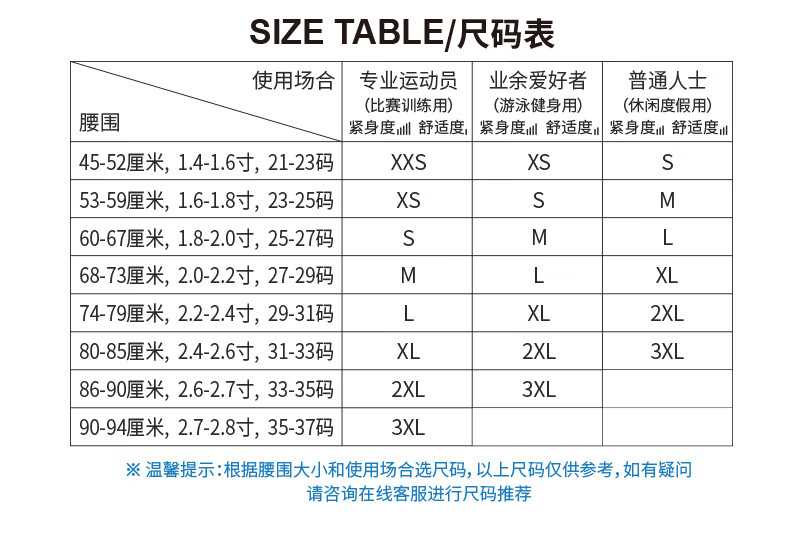 USA(inch) 28-30 30-32 32-34 34-38 38-42