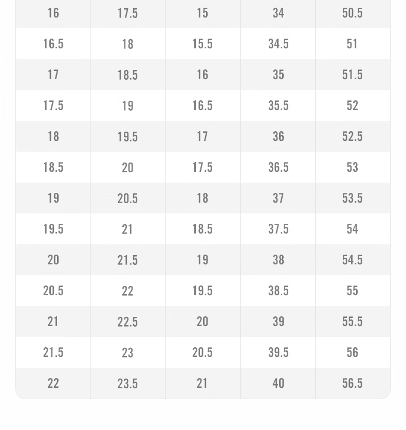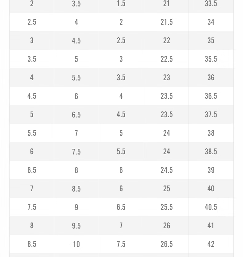 China (cm) 36 - 37 38 - 39 40 - 42 43 - 44 45 - 47