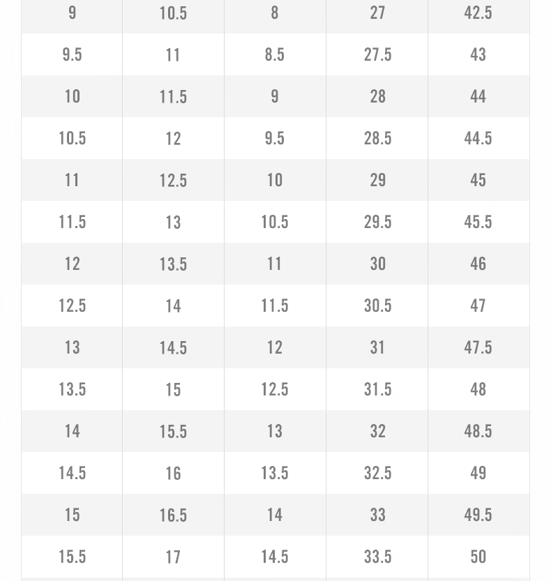 USA 5 5.5 6 7 7.5 8.5 9.5 10 10.5 12 13 14 15.5