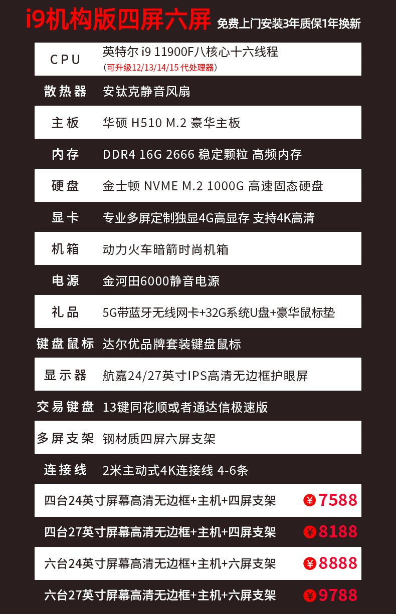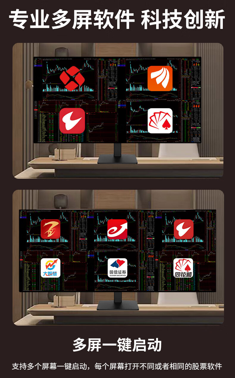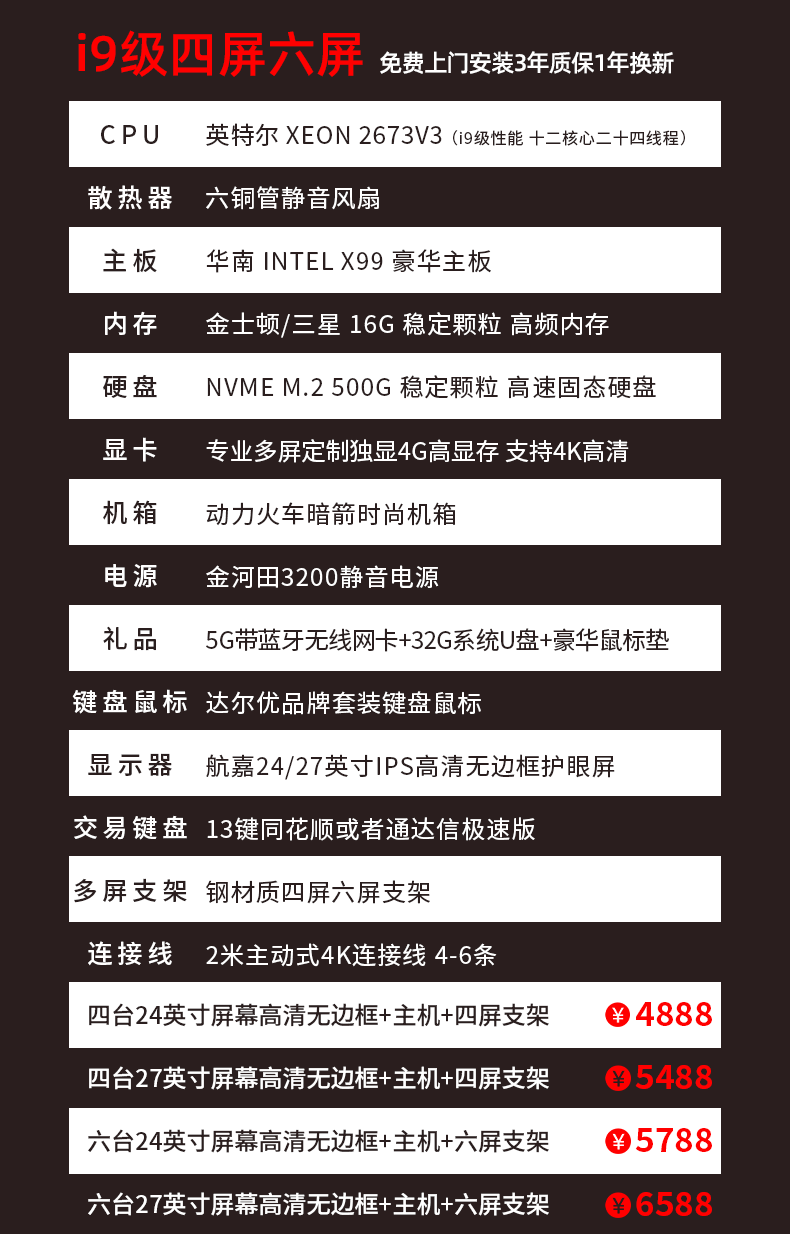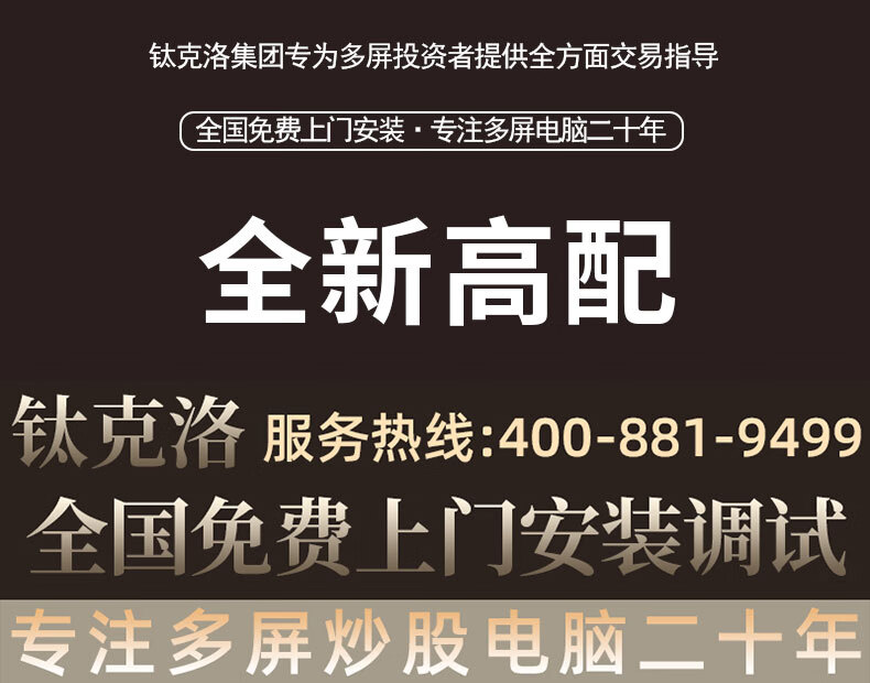 Titanium's nationwide door-to-door installation of professional multi-screen stock trading computers with four screens, six screens, eight screens and twelve screens supports private customization of institutional futures and stock trading virtual currency packages. Four-screen i7 Master Edition 24 HD borderless