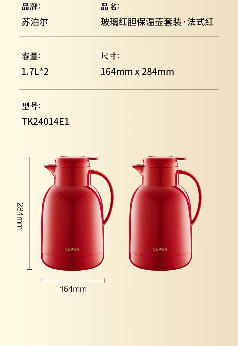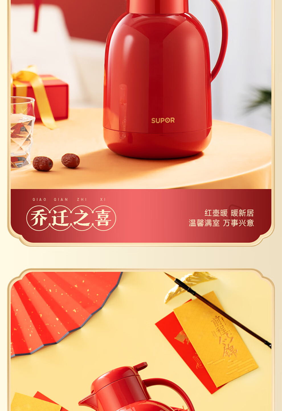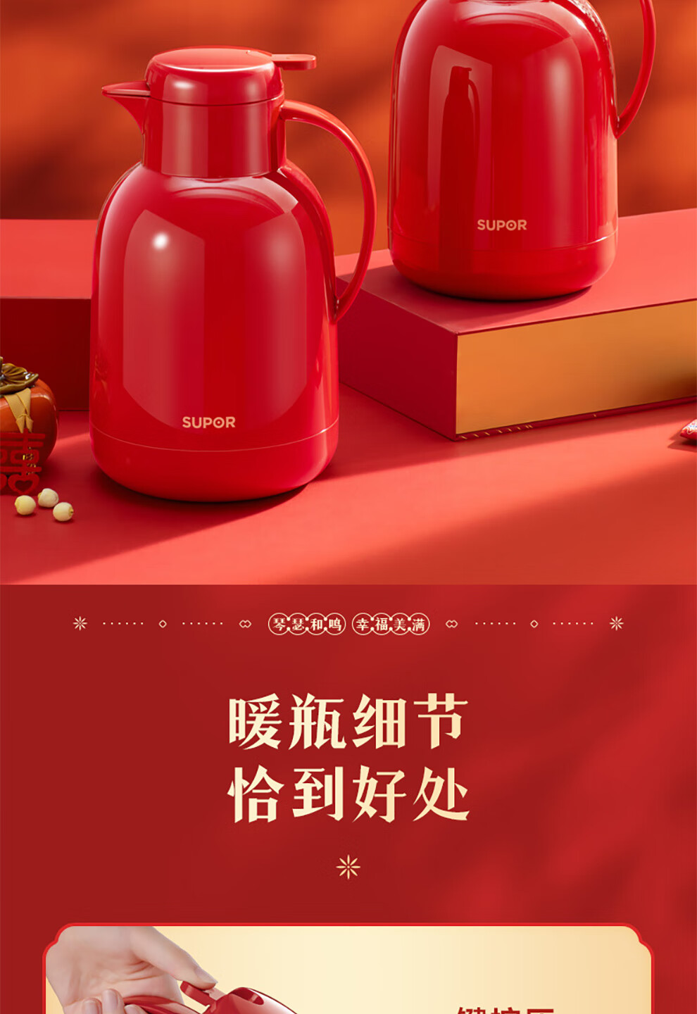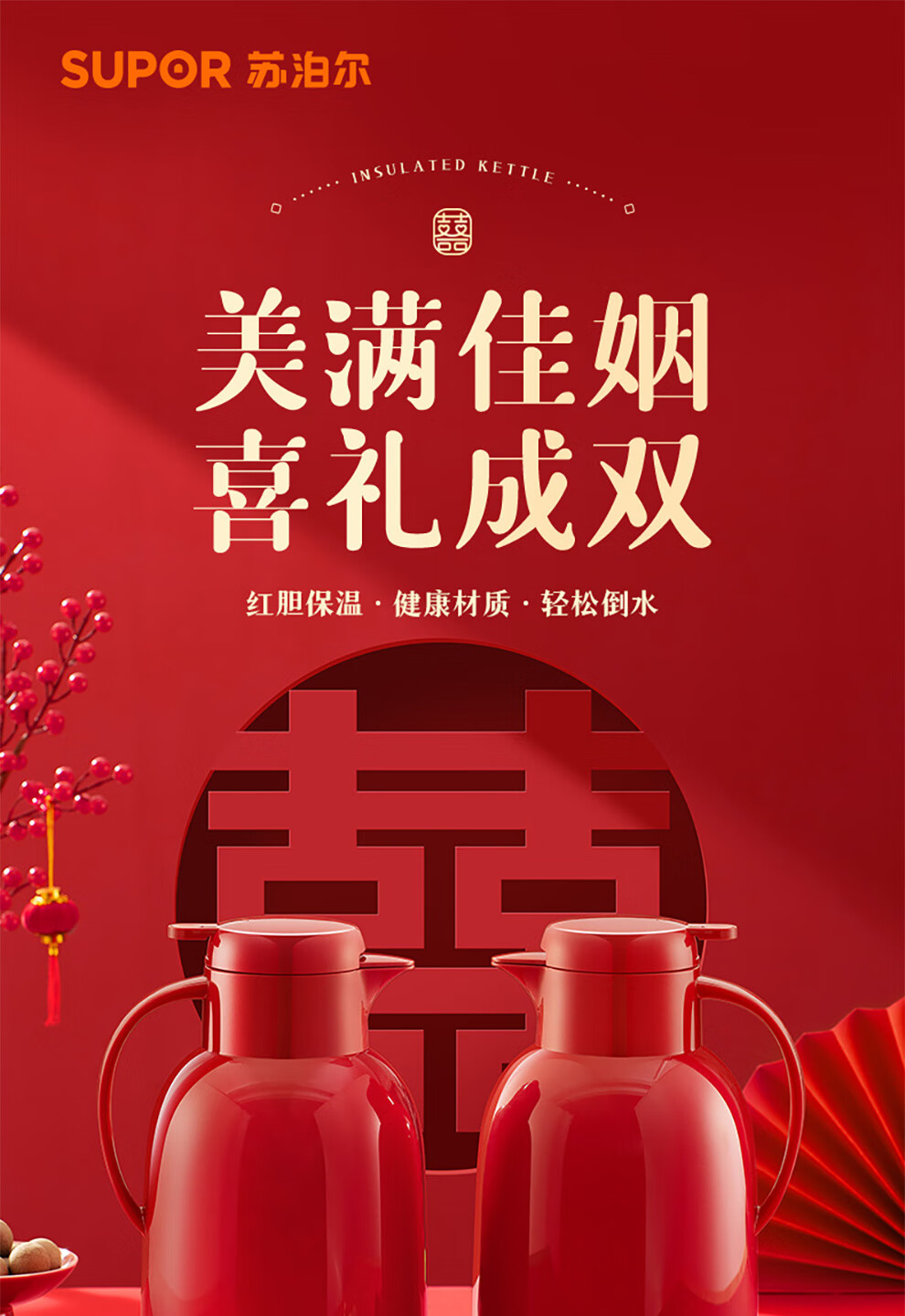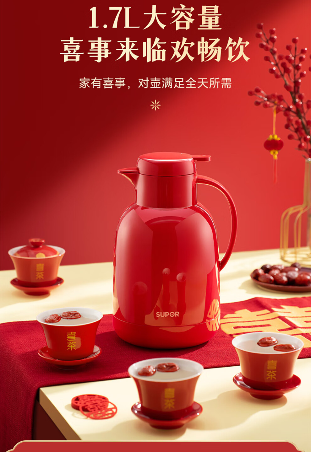 SUPOR thermos kettle wedding kettle red dowry pair thermos kettle household glass liner large capacity thermos bottle carmine 1.7L pair of kettles gift bag + stickers