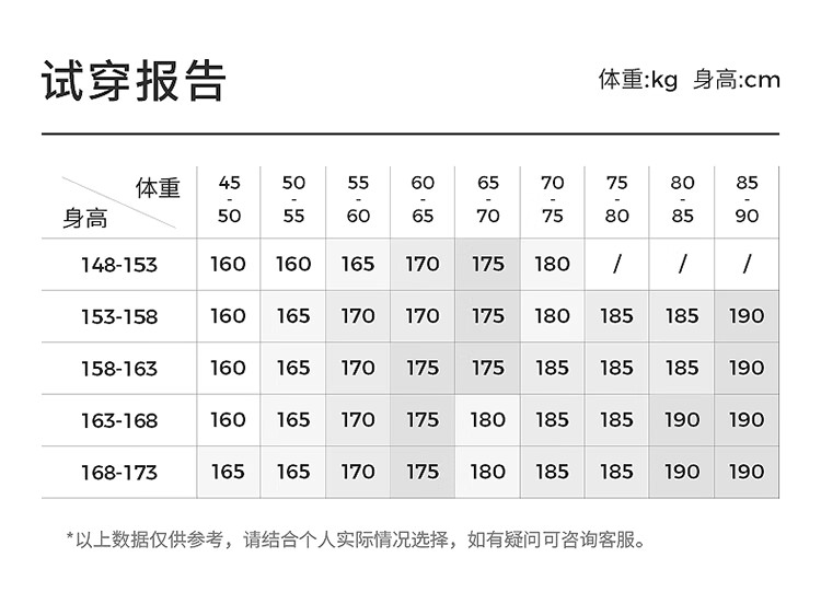 China (cm) 160-165/84-86 165-170 / 88-90 167-172 / 92-96 168-173 / 98-102 170-176 / 106-110