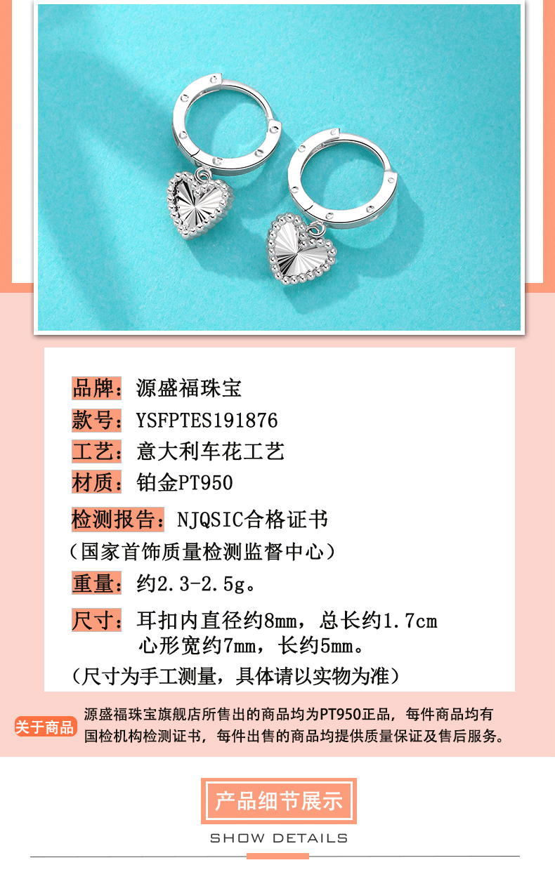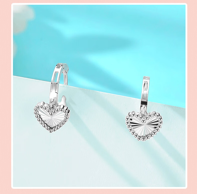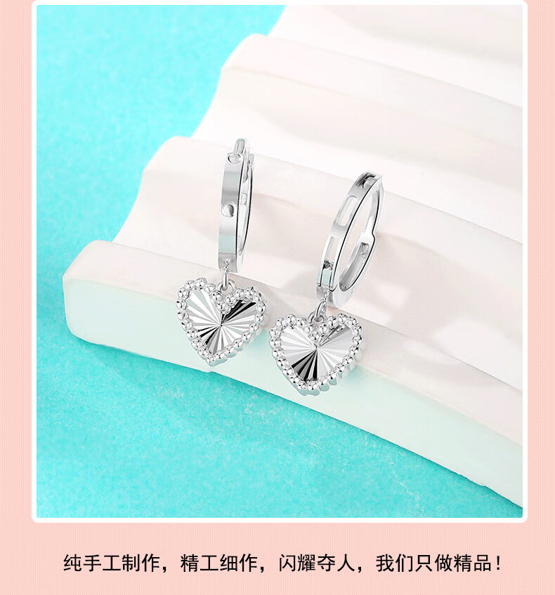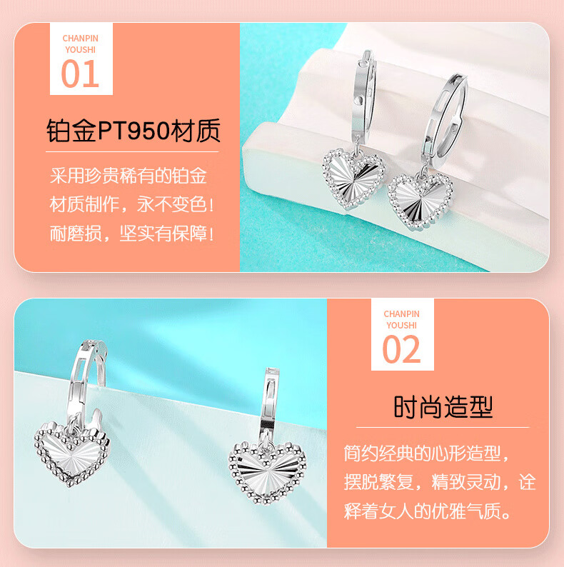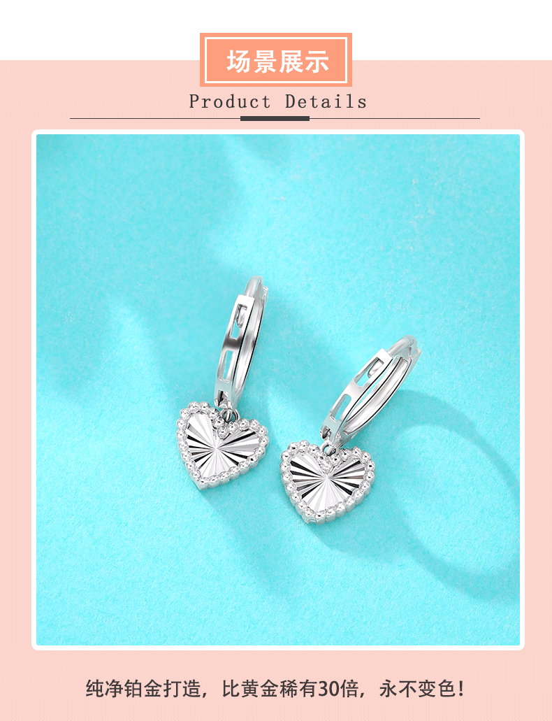 Yuan Shengfu's new boutique PT950 heart-shaped imitation diamond platinum earrings, simple and versatile platinum earrings, platinum heart-shaped earrings, 2.46g