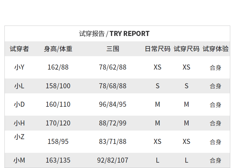 China (cm) 160-165/84-86 165-170 / 88-90 167-172 / 92-96 168-173 / 98-102 170-176 / 106-110