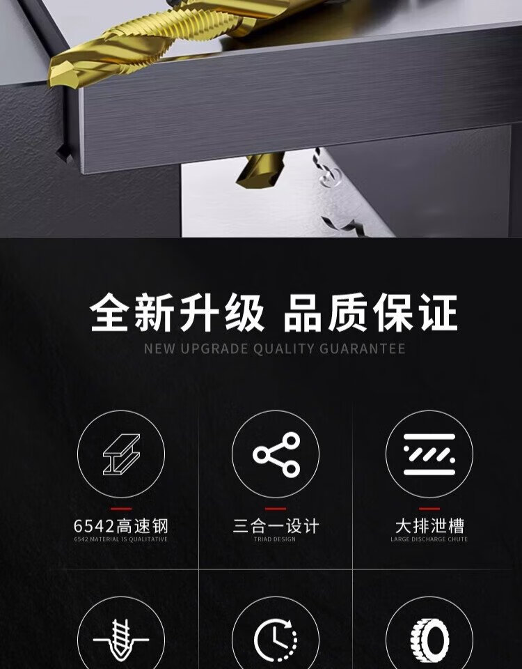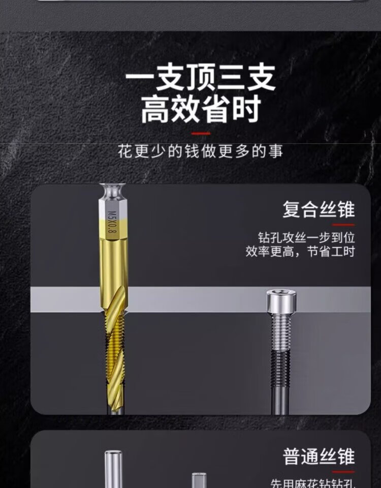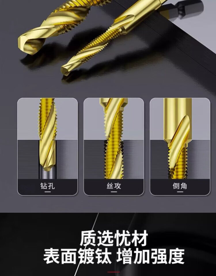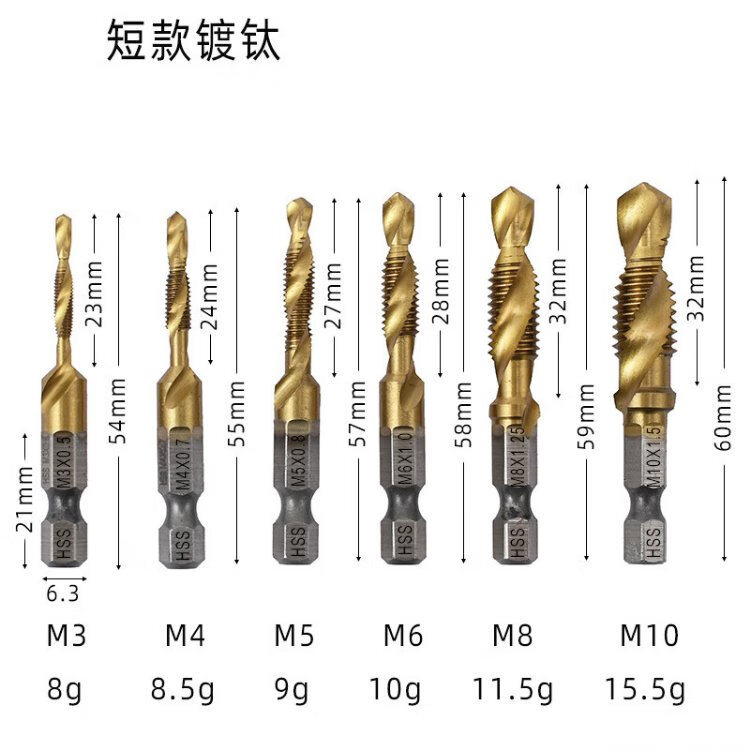 Composite tap for Zhizhou drilling and tapping machine, titanium-plated hexagonal handle thread tapping electric drill bit tap set 6pc short gold M3M4M5M6M8M10