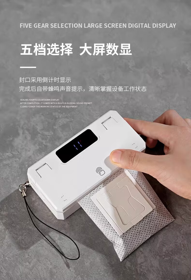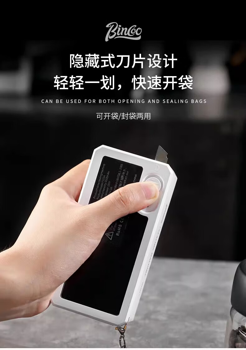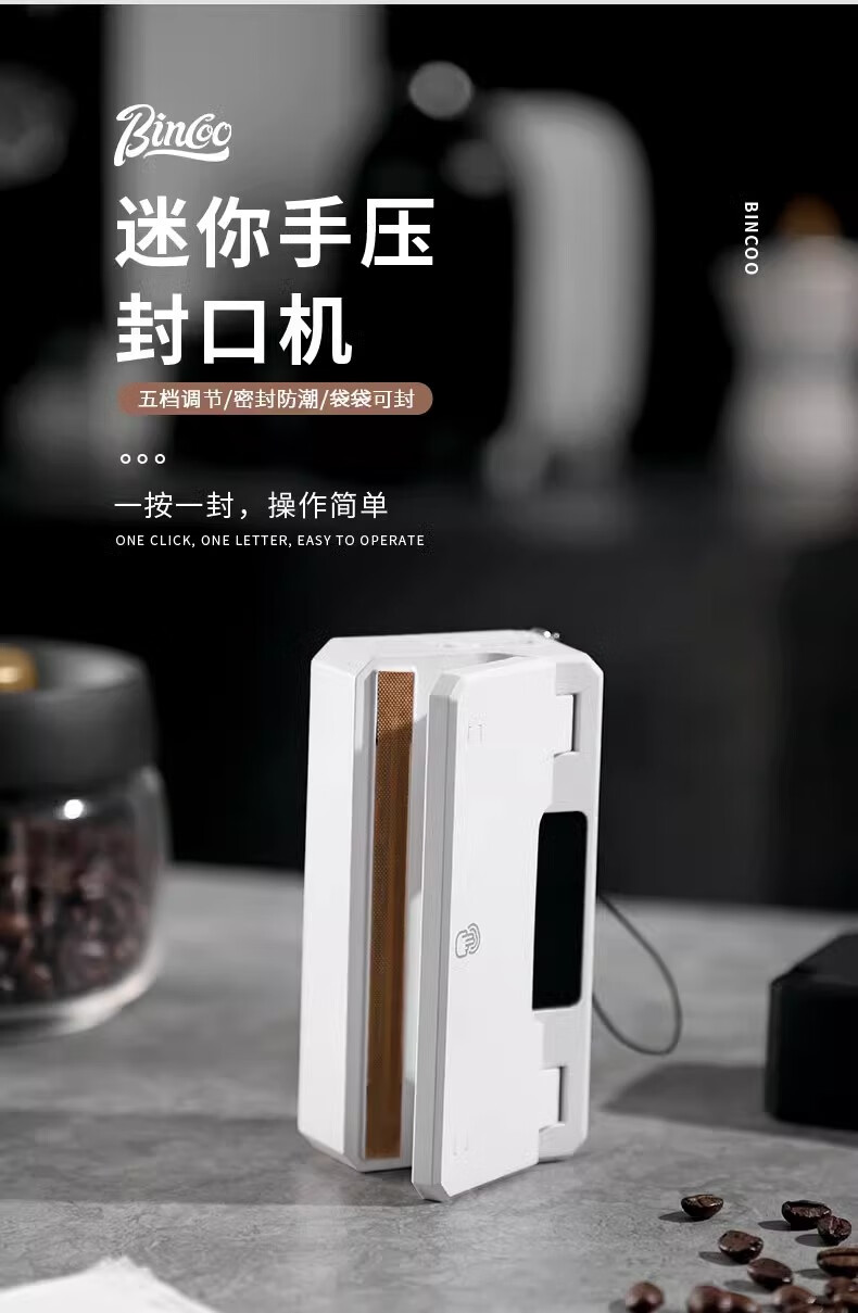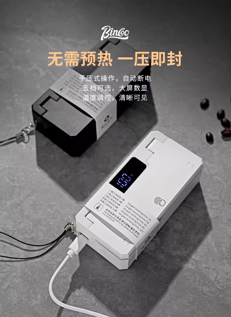 Bincoo ear-hanging coffee sealing machine portable hand pressure sealing artifact snack mini sealing machine plastic bag heat sealing white intelligent digital display 5-speed adjustment