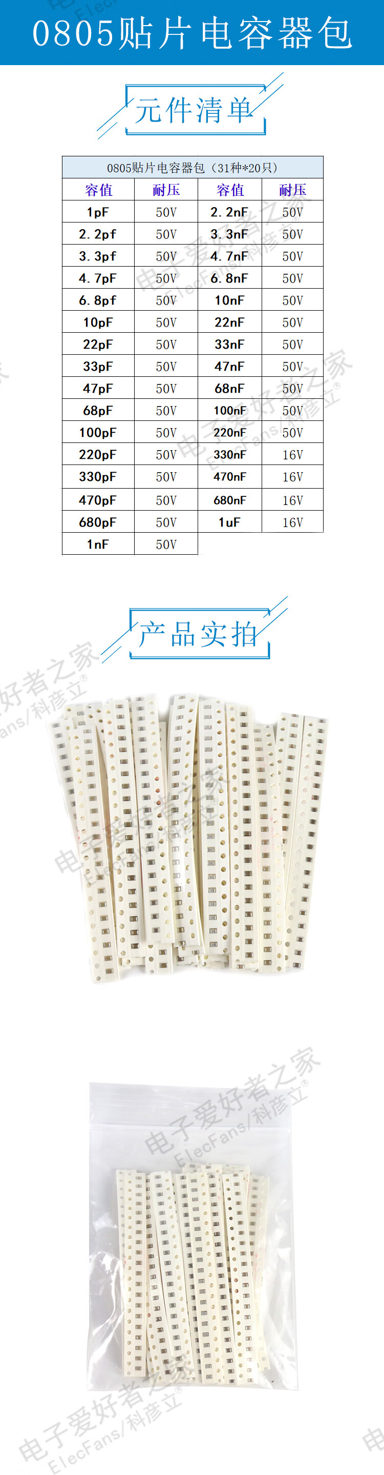 0805 chip capacitor package 1pF-1nf-100nf/104/0.1uf-1uf-1uF 31 values ​​20 each 0805 chip capacitor package