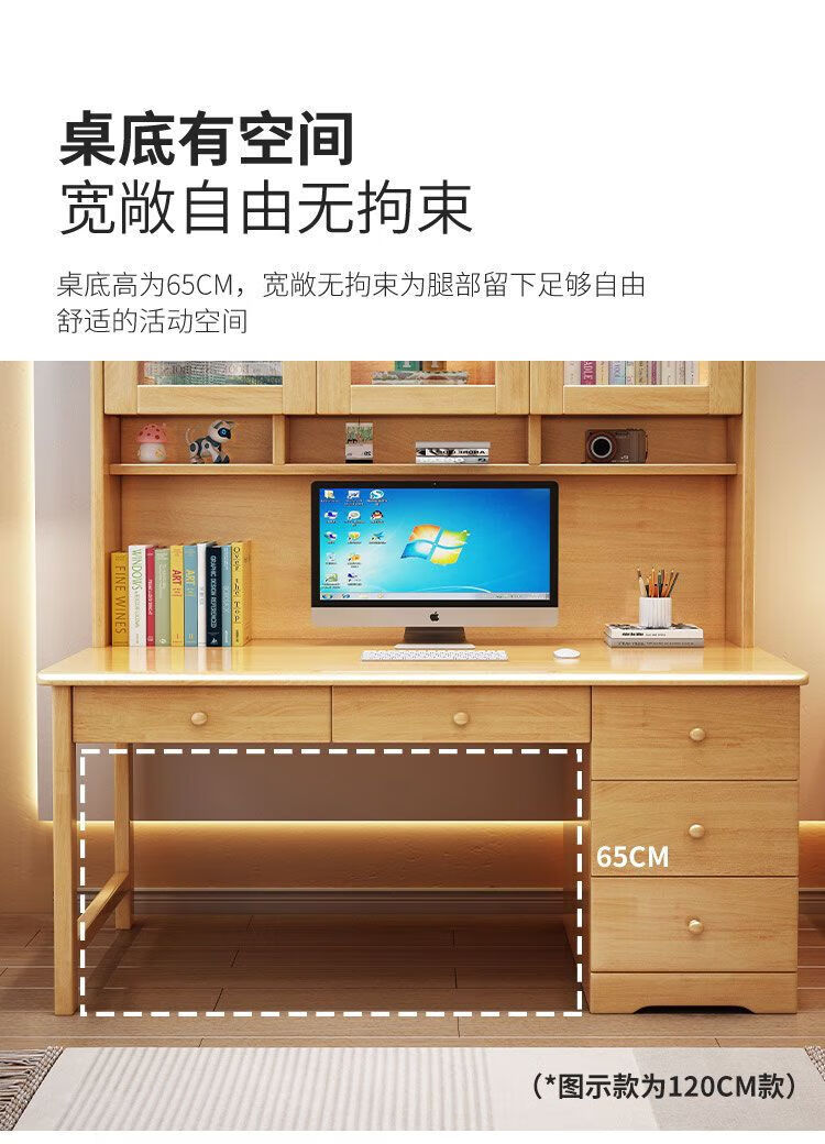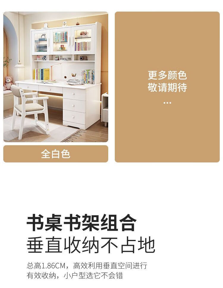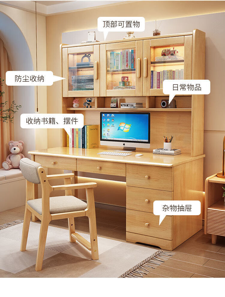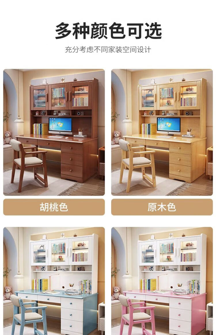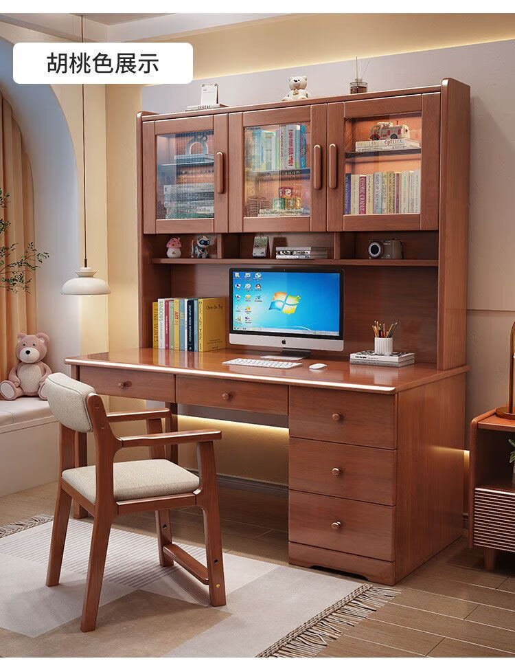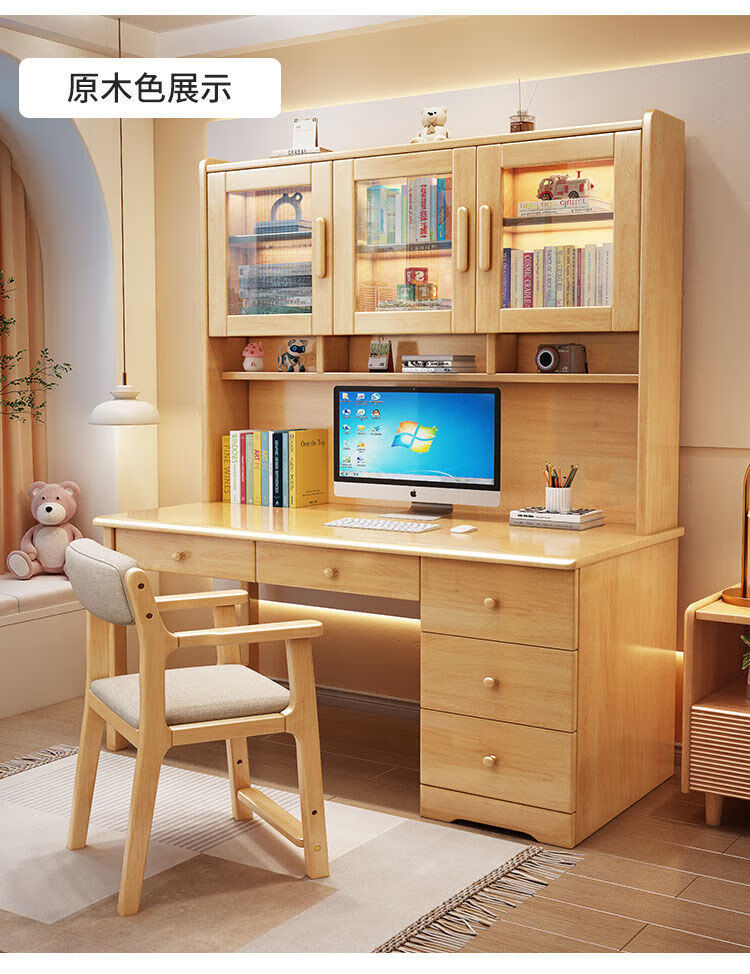 Solid wood desk computer desk bookshelf bookcase integrated combination children's study table and chair bedroom student writing table home YAYJ616# solid wood color single table 100x60x186cm